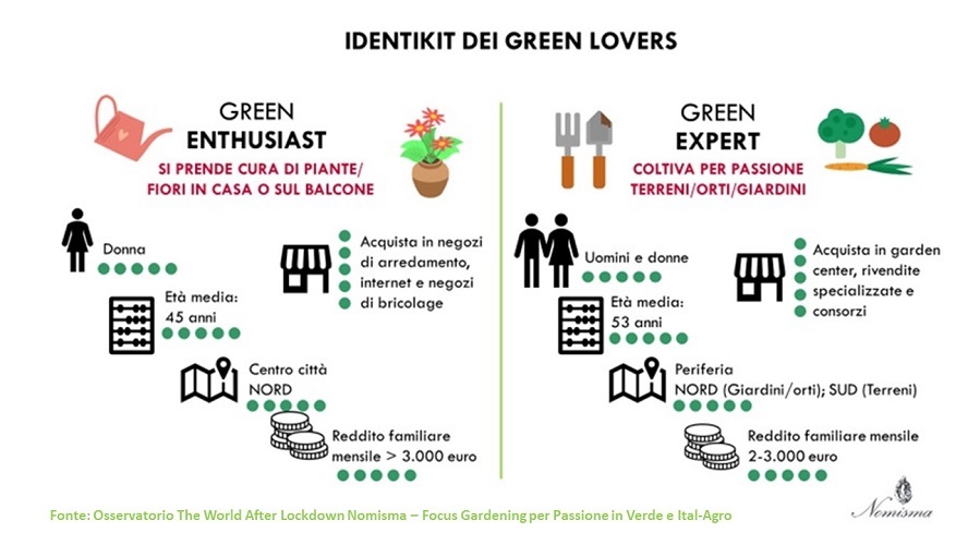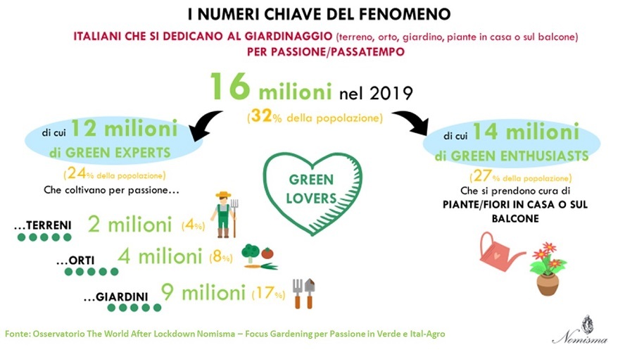 L’analisi distingue in due categorie i giardinieri amatoriali: i green expert (erano 12 milioni di italianinel 2019) che si dedicano alla coltivazione di orti e giardini e i green enthusiast (14 milioni) che si limitano al giardinaggio domestico e sul terrazzo.