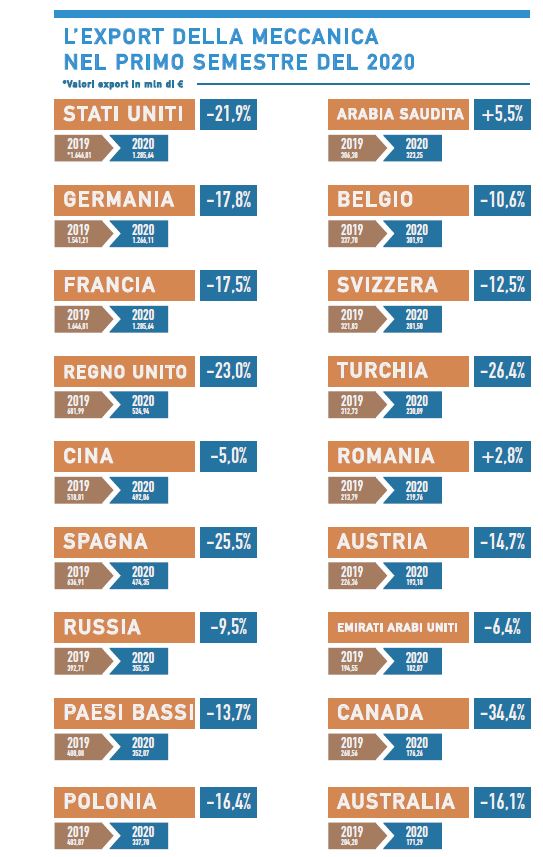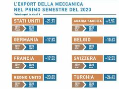 Gli Stati Uniti rimangono la prima destinazione export della meccanica italiana con 1,29 miliardi di euro di scambi commerciali nel primo semestre 2020, nonostante il crollo del -21,9% rispetto allo stesso periodo del 2019. Anche la Germania, che mantiene il secondo posto tra i paesi di destinazione export, soffre una forte riduzione (-17,8%). Così anche la Francia (-17,5%), il Regno Unito (-23%) e la Spagna (-25,5%).