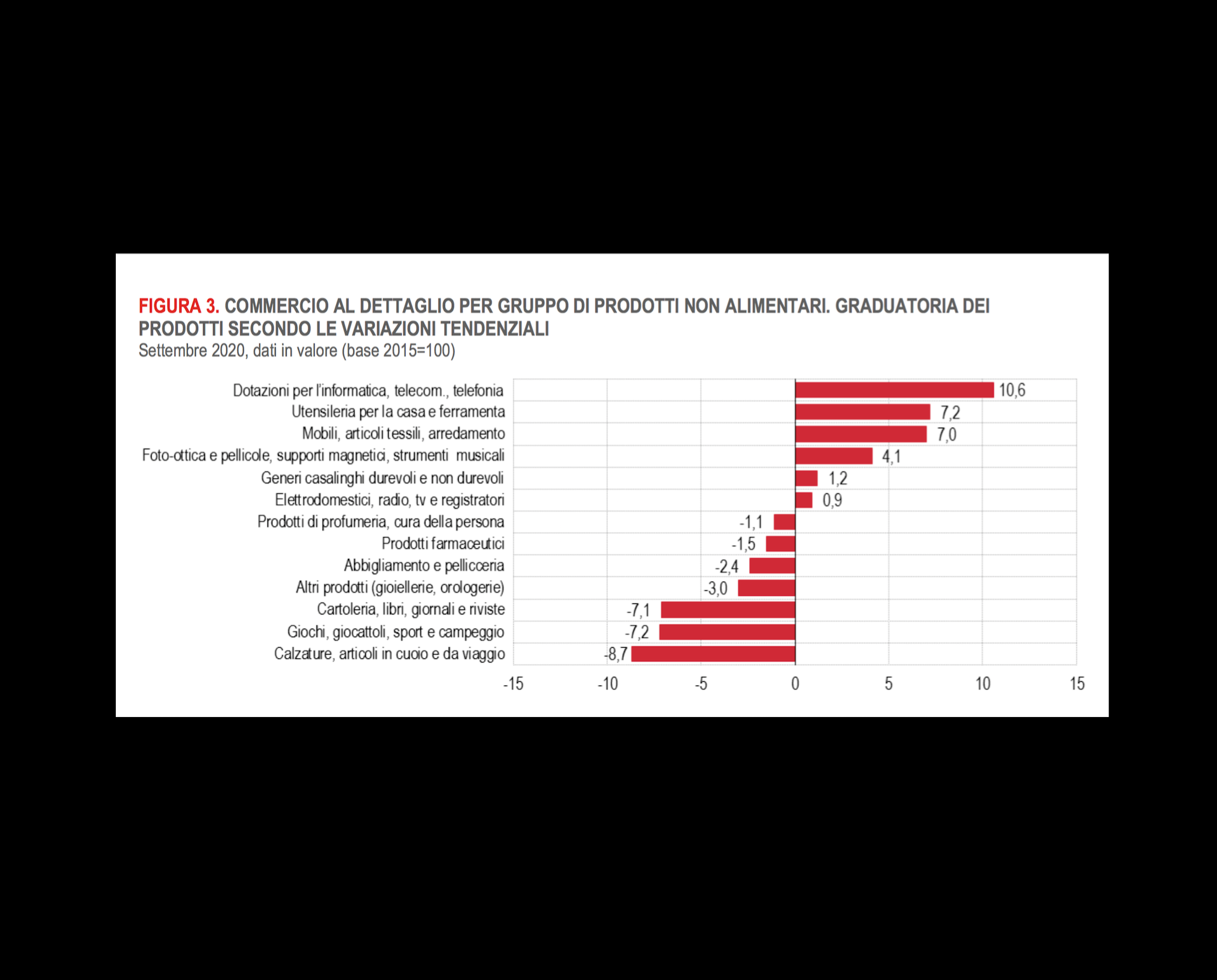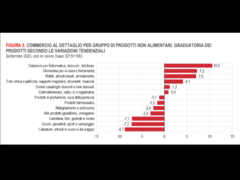 Per quanto riguarda le vendite in generale, a settembre 2020 si stima, per il dettaglio, una diminuzione rispetto ad agosto dello 0,8% in valore e dello 0,4% in volume. In calo le vendite dei beni non alimentari (-1,3% in valore e -0,7% in volume) mentre quelle dei beni alimentari sono sostanzialmente stazionarie (invariate in valore e in lieve crescita, +0,1%, in volume).