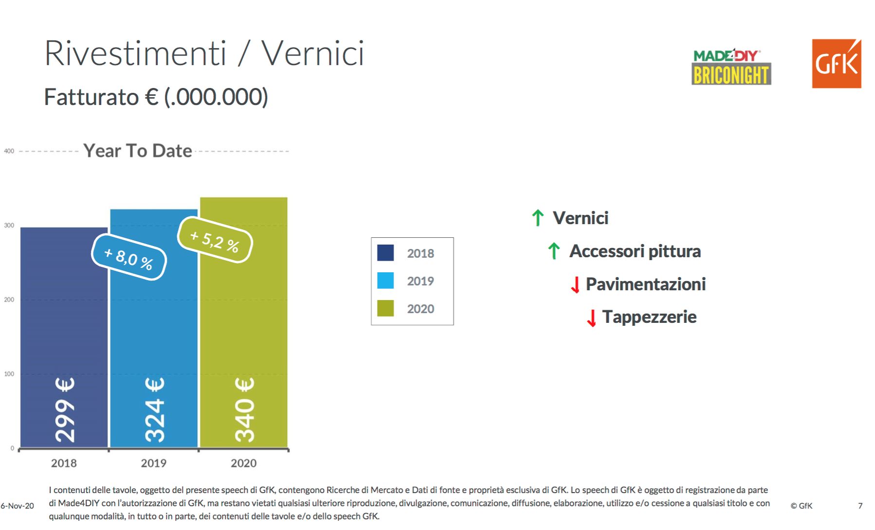 In particolare, nel segmento "rivestimenti/vernici", che nei primi 9 mesi dell'anno vale 340 milioni di euro (+5,2% sul 2019), buone prestazioni per vernici e accessori pittura, leggero calo per pavimentazioni e tappezzeria.