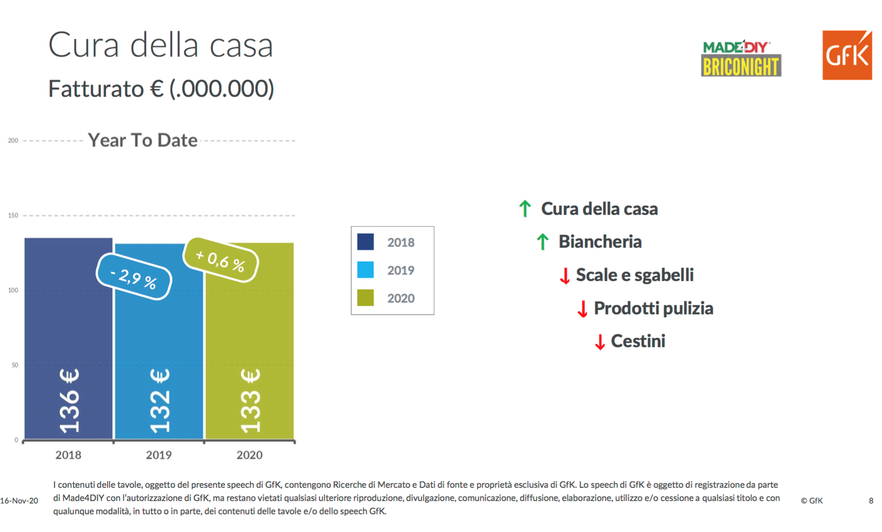Nel comparto "cura della casa" (133 milioni di fatturato, in linea con il 2019), in crescita biancheria e cura della casa, in calo scale e sgabelli, prodotti pulizia e cestini.