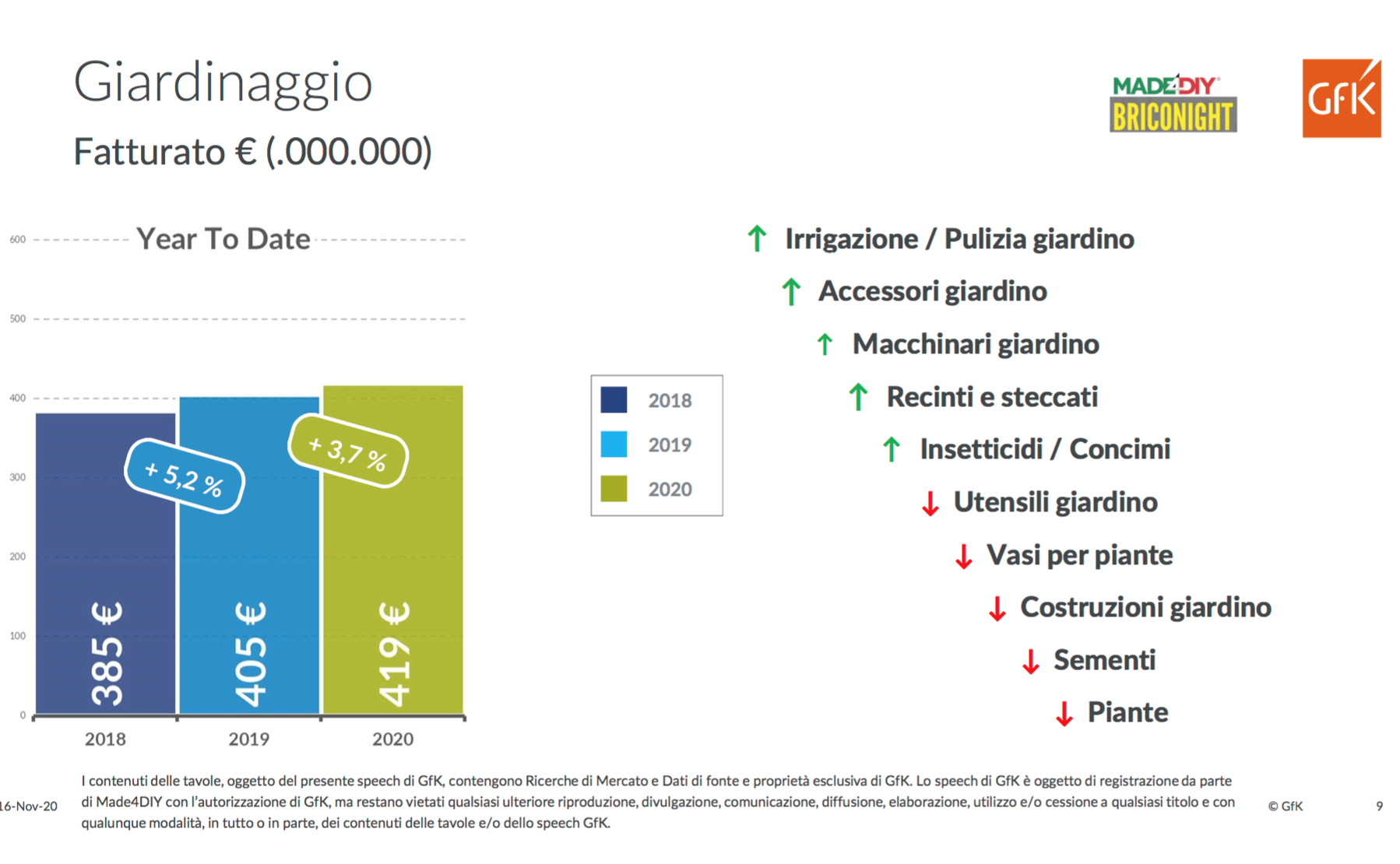 Nel comparto "giardinaggio" (419 milioni di fatturato, +3,7% sul 2019), in crescita irrigazione, accessori, macchine, recinti, concimi, insetticidi; in calo utensili, vasi, costruzioni, sementi, piante.