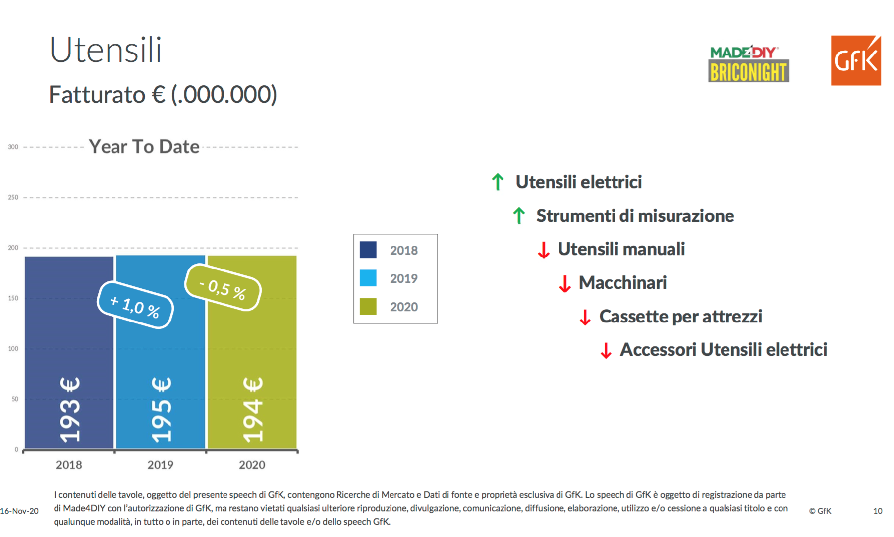 Da gennaio a settembre, il fatturato totale del canale DIY in Italia ha raggiunto la cifra di 3,47 miliardi di euro, con un calo dell'1,4% sui primi 9 mesi del 2019 ma in leggera crescita rispetto allo stesso periodo del 2018.