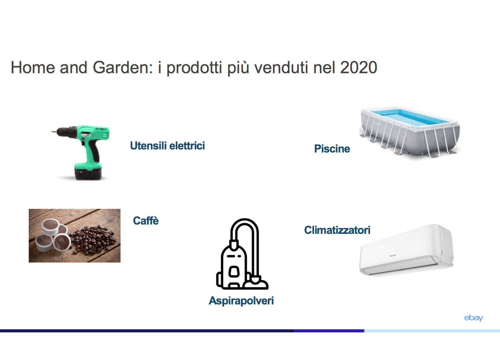 "Ci piace ricordare che ogni 13 secondi viene venduto su eBay un prodotto relativo a merceologie brico-garden" ha dichiarato nel corso del webinar Giorgio Zonca, il quale ha anche indicato i prodotti più venduti dell'anno nel comparto home&garden: utensili elettrici, piscine, elettrodomestici, climatizzatori.