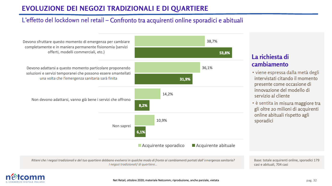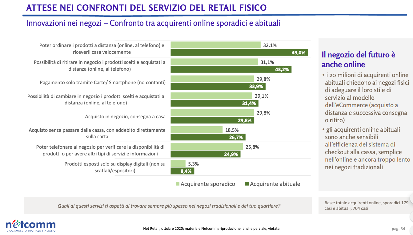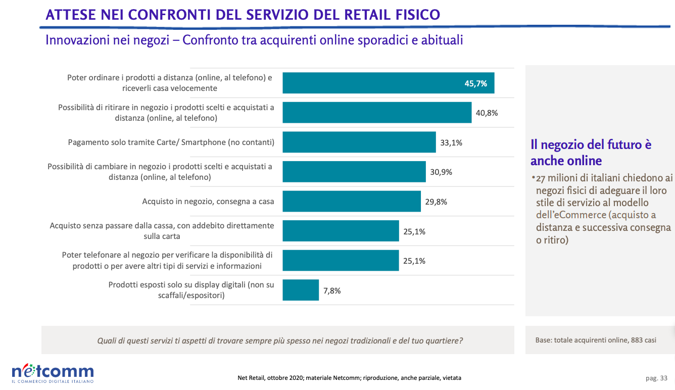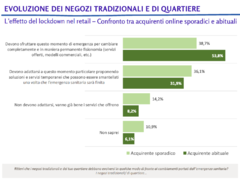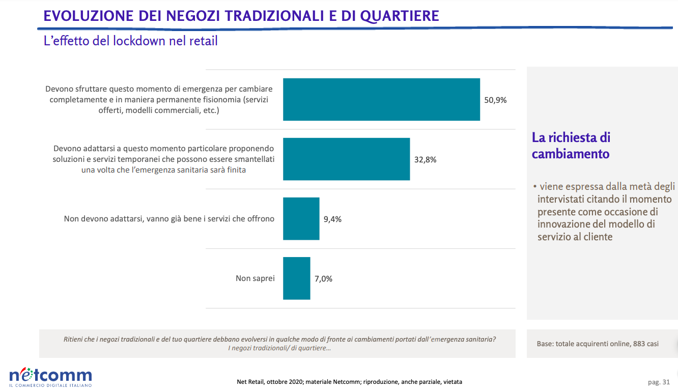 Da una recente ricerca di Netcomm, è emerso che la metà (51%) degli eShopper ritiene che i negozi tradizionali debbano sfruttare questo momento di emergenza per cambiare completamente e in maniera permanente fisionomia (servizi offerti, modelli commerciali, ecc). Alcuni dati inediti della stessa ricerca dicono che 27 milioni di italiani chiedono ai negozi fisici di adeguare il loro stile di servizio al modello dell’e-commerce e i servizi più richiesti sono la possibilità di ordinare i prodotti a distanza e riceverli casa velocemente (46%); la possibilità di ritirare in negozio i prodotti scelti e acquistati a distanza (41%); la possibilità di pagare cashless, solo tramite Carte/Smartphone (33%).