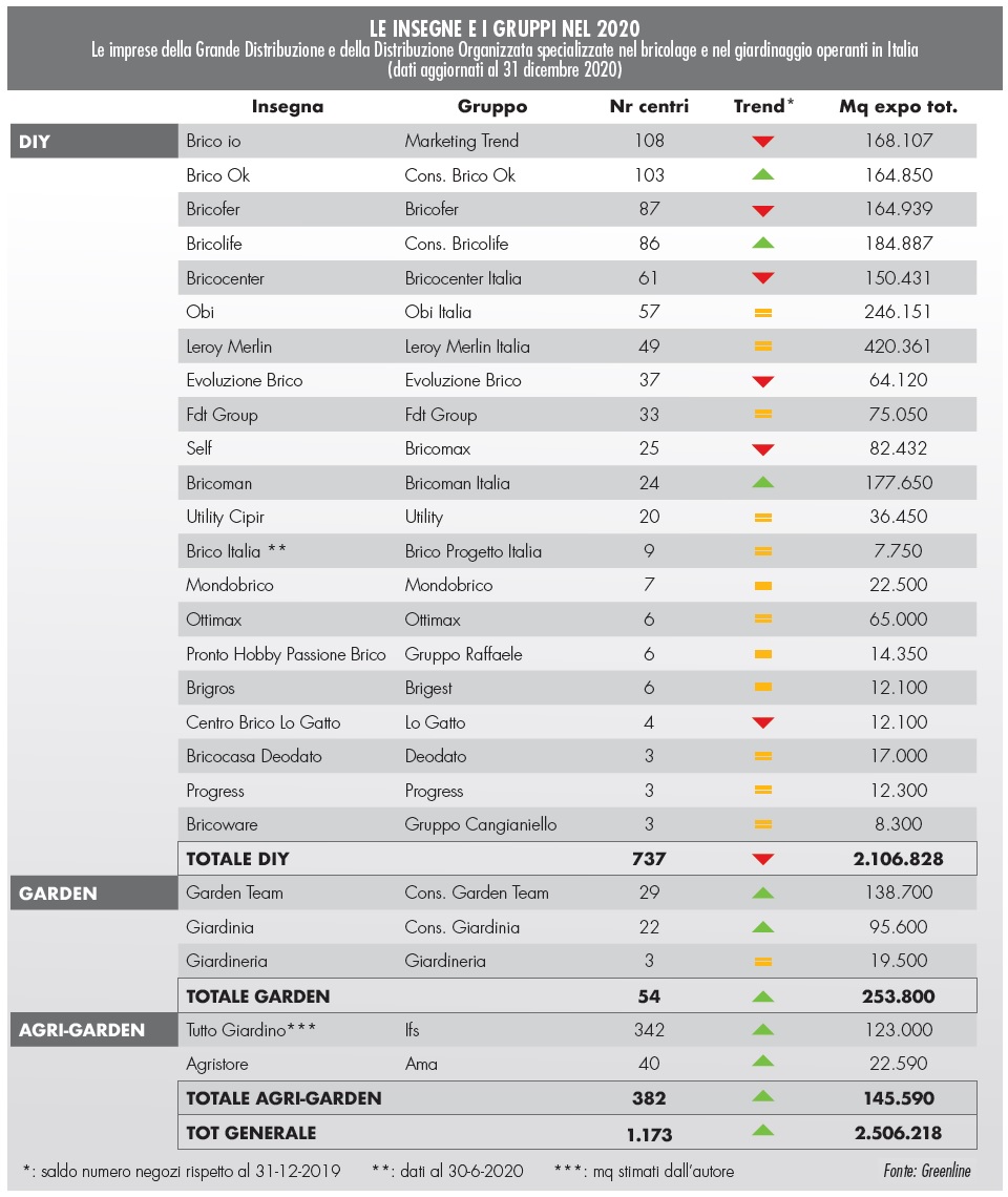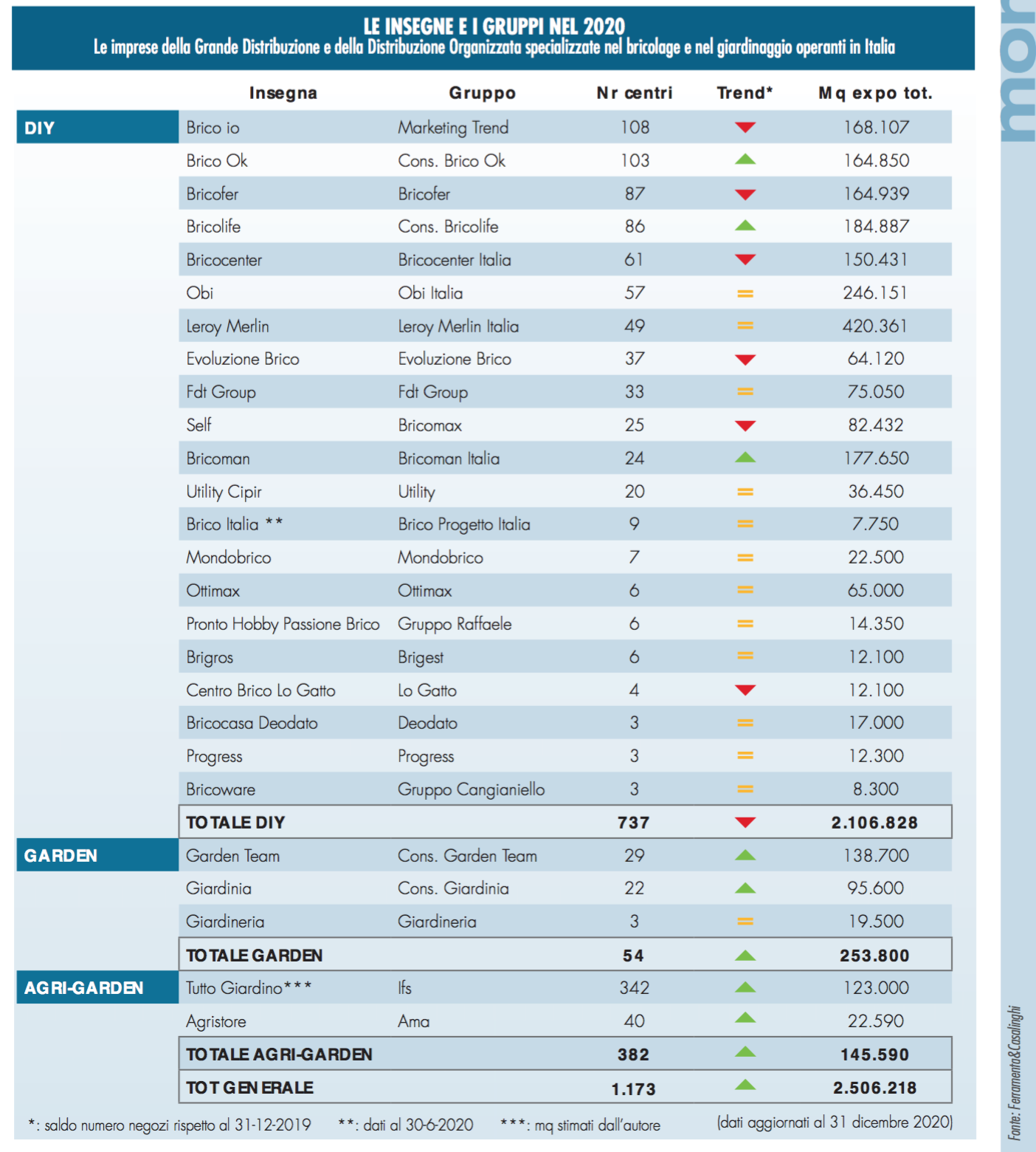 Per fotografare il commercio organizzato specializzato nel brico-garden operante in Italia, abbiamo selezionato le insegne della GDS (Grande Distribuzione Specializzata) e i Gruppi d’Acquisto (Consorzi) con almeno 3 punti vendita e una propensione allo sviluppo.
