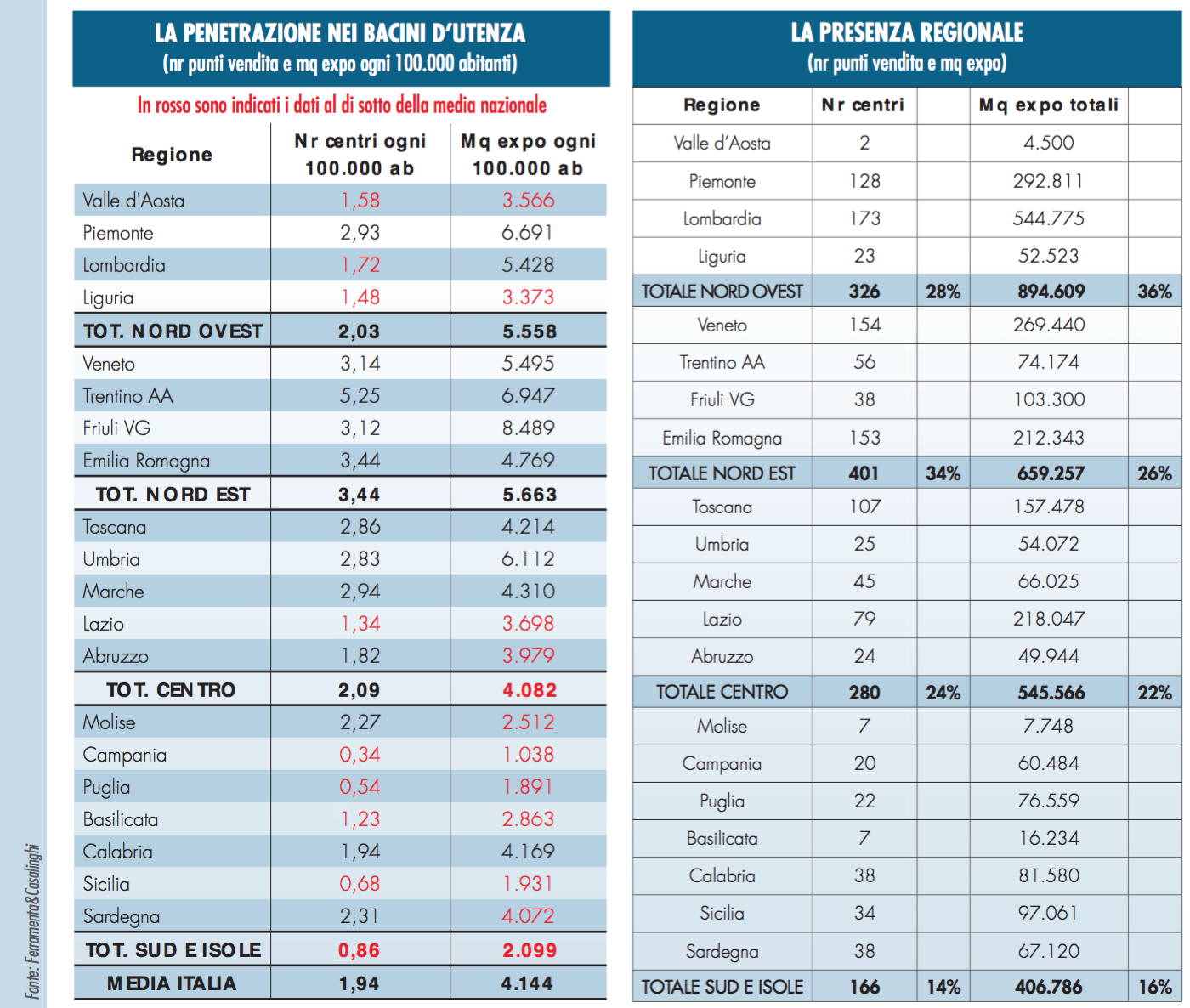 Il 62% di questi negozi, sia per numero sia per metri quadrati espositivi, è nel nord Italia, con una preponderanza numerica del nord-est (34% dei negozi) mentre nel nord-ovest c’è la maggiore superficie espositiva (36%). Seguono le regioni del centro Italia (24% dei negozi) e del sud (14%).