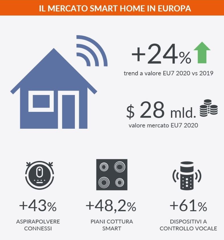 Nel corso del 2020 GfK ha registrato un trend molto positivo per la Tecnologia di consumo e in particolare il segmento dei dispositivi smart per la casa è cresciuto del +24% per un controvalore pari a 28 miliardi di dollari nei 7 principali mercati europei*.