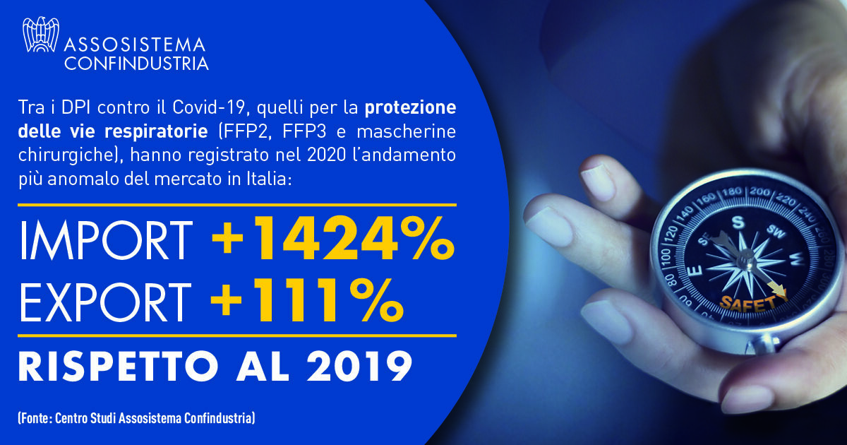 Assosistema Confindustria, l'Associazione che rappresenta, tra le altre, le aziende che producono e distribuiscono i Dispositivi di protezione individuale (DPI) ha presentato ieri i risultati dell’analisi: “L’impatto del Covid-19 sull’import/export dei DPI nel 2020”.