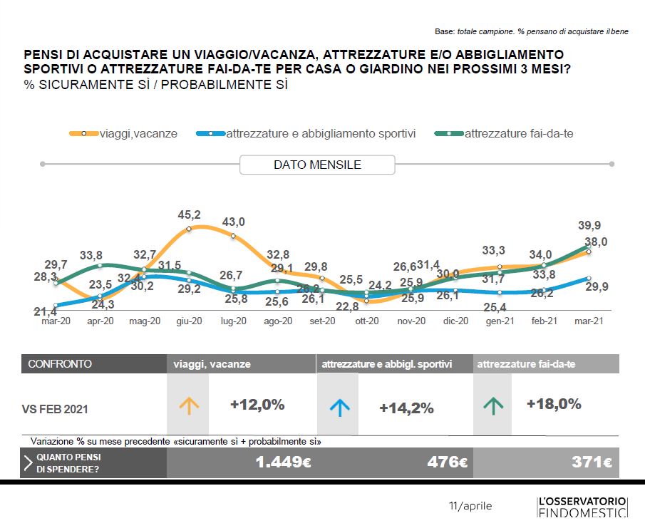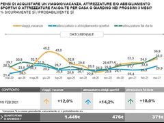 La speranza di un allentamento della diffusione del contagio oltre al prosieguo della campagna vaccinale spingono le intenzioni d’acquisto di viaggi e vacanze da parte degli italiani (+12%) così come quelle per l’attrezzatura sportiva (+14,2%). Un vero e proprio “boom” si registra, infine, per le attrezzature per il fai da te con propensioni all’acquisto in crescita del 18%.