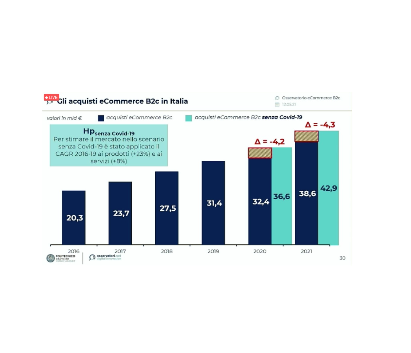 “Rispetto alle prime stime negative, l’eCommerce B2c italiano ha chiuso il 2020 con un saldo positivo di crescita. Il brusco calo registrato dai servizi - in primis dal comparto Turismo e Trasporti - è stato infatti più che compensato dalla straordinaria crescita dei prodotti, spinti dal nuovo lockdown introdotto negli ultimi due mesi dell’anno.” afferma Riccardo Mangiaracina, Responsabile Scientifico dell’Osservatorio eCommerce B2c - School of Management del Politecnico di Milano. “La pandemia ha avuto un duplice impatto. Da un lato, contrariamente a quanto si possa pensare, ha frenato la crescita del mercato eCommerce B2c in Italia, che certamente sarebbe stata più elevata senza l’emergenza sanitaria, con l’eccezione di alcuni settori merceologici come il Food&Grocery in cui ha provocato un’accelerazione del mercato online. Dall’altro ha anche modificato gli equilibri tra online e offline forzando l’offerta a soddisfare le mutate esigenze di consumo e ad accelerare il suo processo di digitalizzazione e spingendo i consumatori a un utilizzo più frequente dei canali online. Questi cambiamenti sono segno di una generale maturazione che permetterà all’eCommerce B2c italiano di continuare a crescere anche nel 2021. In particolare, ci aspettiamo un ulteriore aumento degli acquisti online trainato da un consolidamento nei comparti di prodotto e da una leggera ma significativa ripresa dei servizi”.