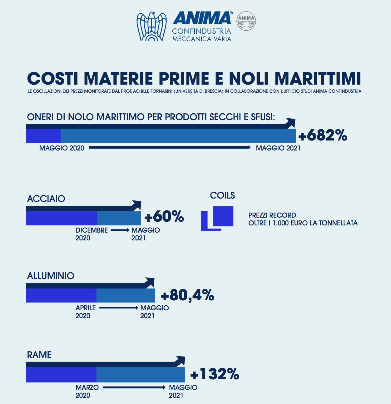 Secondo il professore Achille Fornasini dell’Università di Brescia - che in collaborazione con l’Ufficio Studi di Anima Confindustria sta conducendo un’analisi dei mercati e dei prezzi delle commodity per valutarne gli effetti sull’industria meccanica, «oltre alla debolezza del dollaro, che ha assecondato e favorito la corsa agli approvvigionamenti di materie prime, ha contribuito all’aumento dei materiali basilari anche l’impennata dei costi di trasporto, confermata dall’andamento del Baltic Dry Index, che sintetizza gli oneri di nolo marittimo per prodotti secchi e sfusi: dopo essere crollato in piena epidemia, l’indice ha registrato una performance eccezionale (+682% dal mese di maggio 2020) soprattutto a causa della drastica interruzione delle catene internazionali di fornitura provocate dai primi lockdown». «Inoltre - aggiunge Fornasini - è sopravvenuto un ostinato e persistente controllo dell’offerta di trasporto da parte delle compagnie di navigazione attraverso riprogrammazioni che, privilegiando l’export cinese verso gli Usa, ha generato congestioni nei porti americani dove le movimentazioni sono state rallentate dall’emergenza sanitaria. Analoga la situazione riguardante le navi portacontainer, i cui noli sono quintuplicati nell’arco di un solo anno come conseguenza di una diffusa carenza dovuta alla dislocazione squilibrata dei contenitori. Tutto ciò - prosegue Fornasini - nel quadro di proficue alleanze strategiche stabilite tra le maggiori società di shipping grazie alle esenzioni dalle norme antitrust europee, che spingono fatalmente verso oligopoli in grado di gestire anche i terminal e i trasporti terrestri».