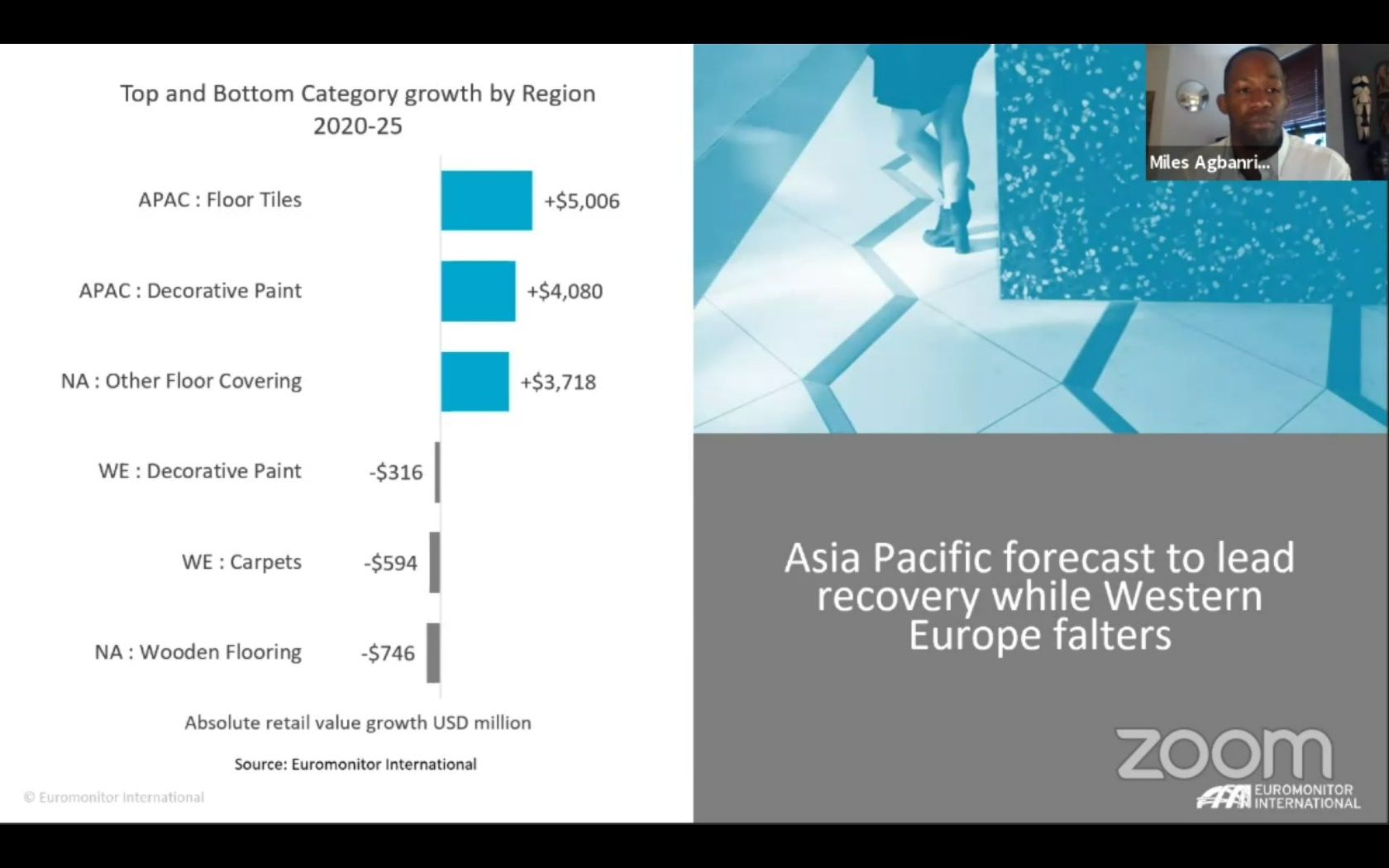 Il calo complessivo ha invece riguardato principalmente i Paesi dell'Est asiatico come l'India, Taiwan e la Cina. Le vendite di pavimenti in legno nella regione Asia-Pacifico, ad esempio, sono diminuite di 1,542 miliardi di euro, le vendite di pitture di 1,746 miliardi di euro) e le vendite di piastrelle per pavimenti sono diminuite di 2,592 miliardi di euro.