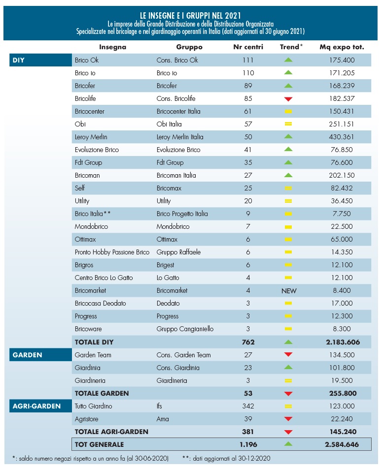 Dopo un 2020 che ha ovviamente limitato lo sviluppo di nuovi punti vendita, nel primo semestre 2021 abbiamo assistito a una ripresa della crescita del network di negozi legati alle insegne specializzate nel diy e nel gardening. I negozi che fanno capo ai 27 gruppi distributivi operanti in Italia sono infatti 1.196, con un incremento del 2,7% rispetto a un anno fa, cioè il 30 giugno 2020. Le superfici espositive sono aumentate del 3,3%, sempre rispetto a un anno fa, con oltre 2,5 milioni di mq.