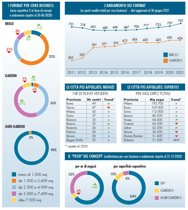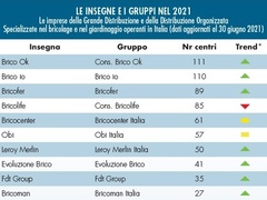 Tra le altre insegne che hanno ampliato la rete nel 2021 ricordiamo anche Fdt Group che ha aperto ad Ardenno (SO), Concesio (BS) e Sassoferrato (AN), Brico io che ha inaugurato a Monfalcone (Go), San Cesareo (RM) e Opera (MI) e Bricofer che ampliato la rete con i