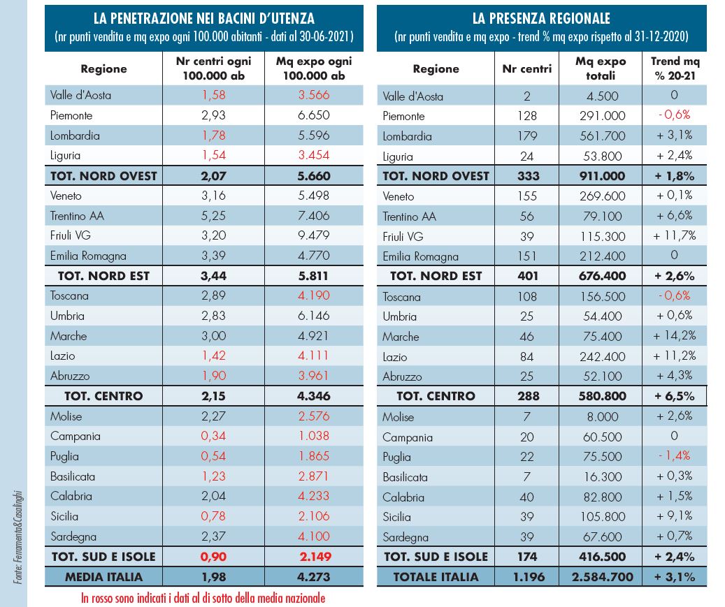 Le regioni con la maggiore concentrazione espositiva rispetto alla popolazione sono il Friuli (9.479 mq), il Trentino (7.406 mq) e il Piemonte (6.650 mq).