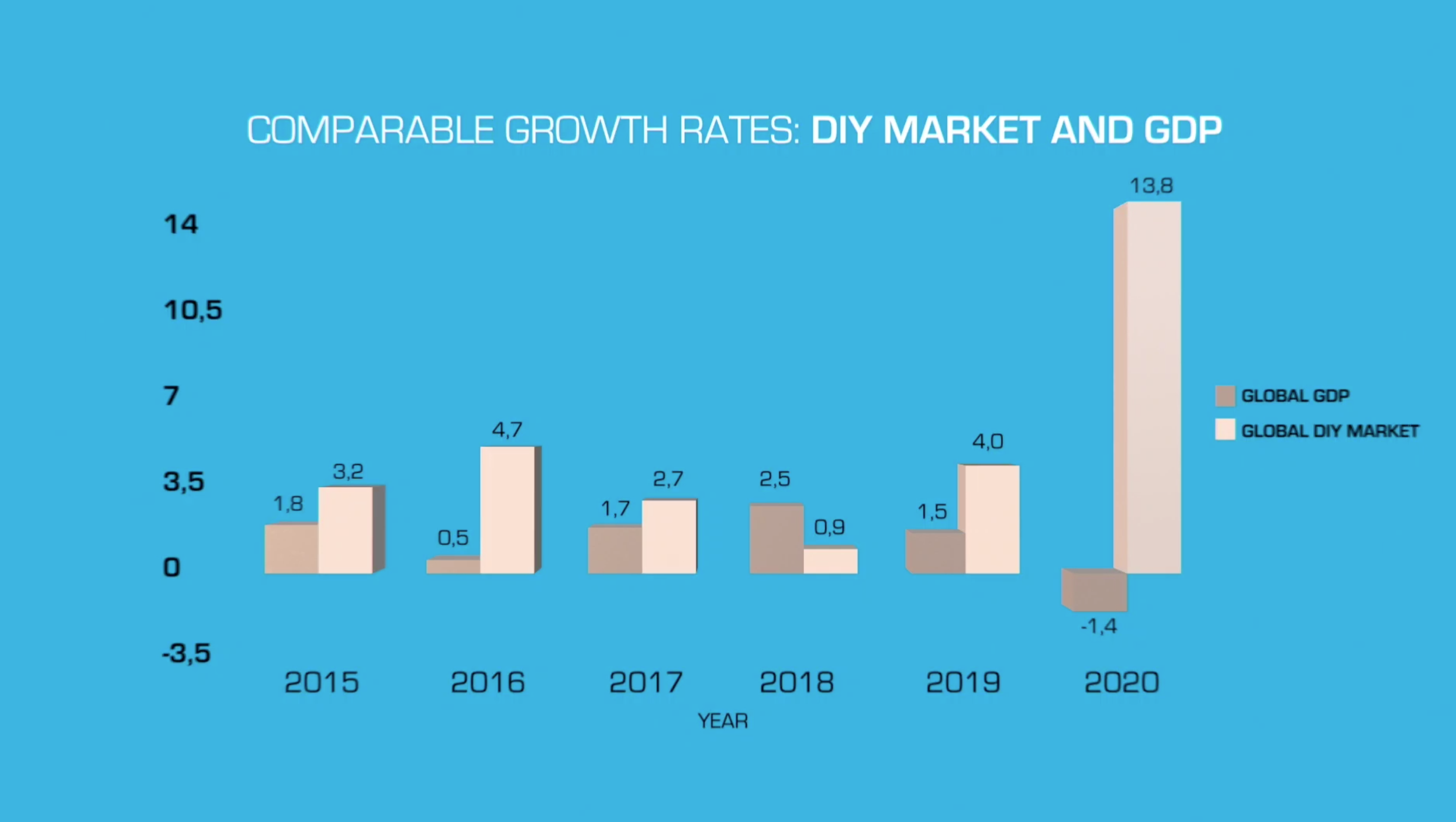 Il valore totale a livello mondiale del DIY nel 2020 è di 702 miliardi di euro, con una crescita sul 2019 del 13,8%, dato che impressiona se paragonato alle stesse percentuali degli anni precedenti, che mai avevano superato il 4,7%.