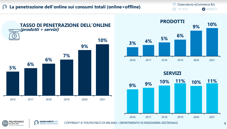 “Oggi l’eCommerce viene scelto in modo consapevole per gli acquisti quotidiani da un numero crescente di italiani” continua Valentina Pontiggia, direttore dell’Osservatorio eCommerce B2c “Nel 2021 l’incidenza dell’eCommerce B2c sul totale vendite Retail, indice della maturità online, raggiunge il 10% (era il 9% nel 2020). Nella sola componente di prodotto la penetrazione passa dal 9% nel 2020 al 10% nel 2021 (+1 punto percentuale rispetto al 2020), con un incremento più contenuto rispetto a quello osservato tra 2019 e 2020 (+3 punti percentuali). Nel 2021, aumenta anche l’incidenza della componente servizio che passa dal 10% all’11%”.
