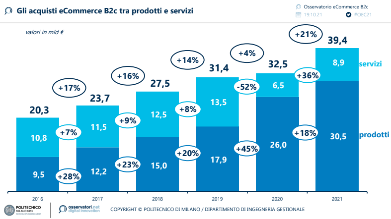 Analisi » Nel 2021 l'e-commerce in Italia vale 39,4 miliardi di euro (+21% sul 2020)
