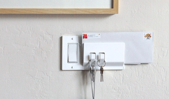 Walhubè una placca per interruttori intelligente e funzionale: integra al suo interno numerosi accessori quali, portachiavi, porta lettere, appendi abiti ed addirittura porta ombrello.