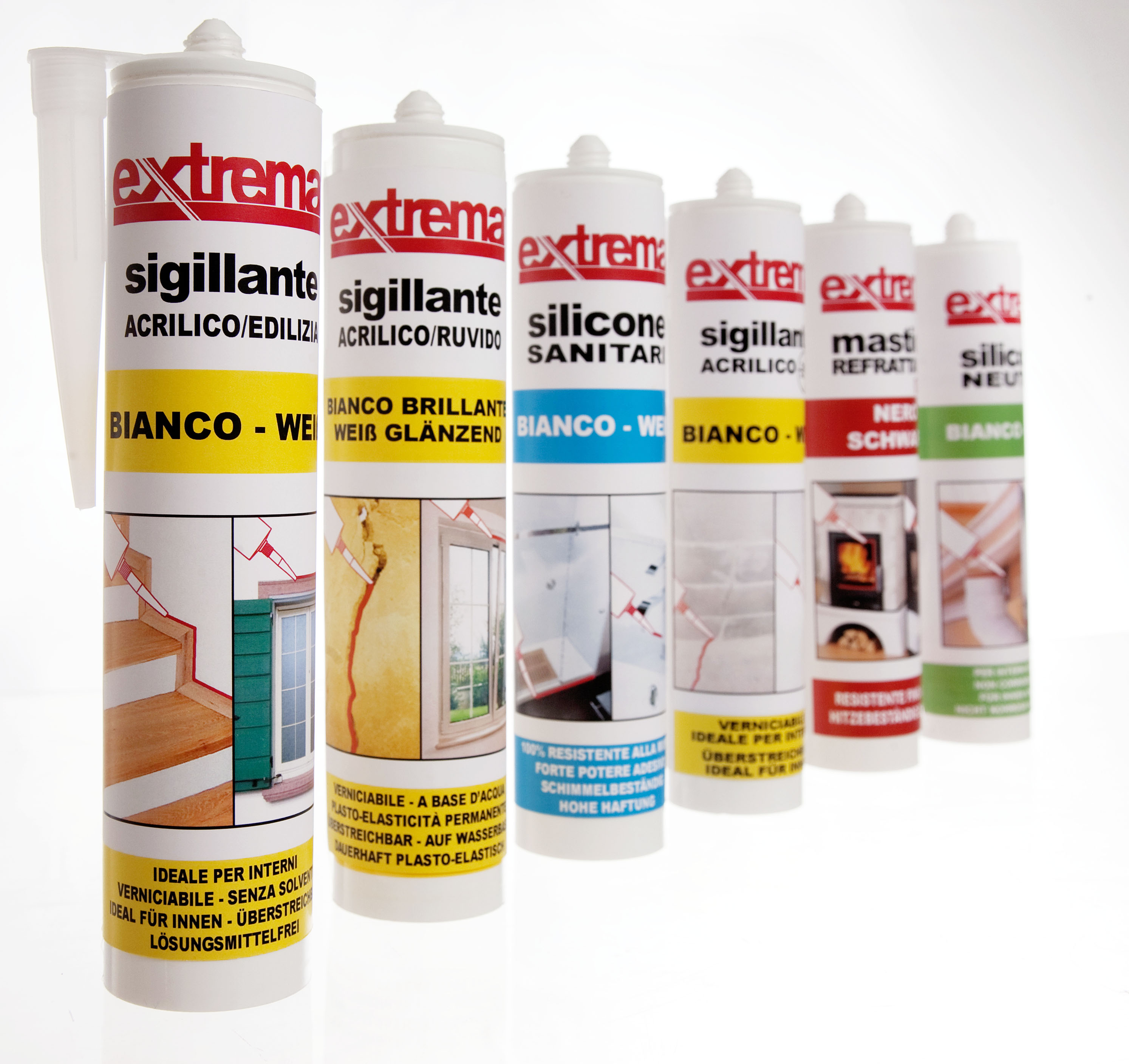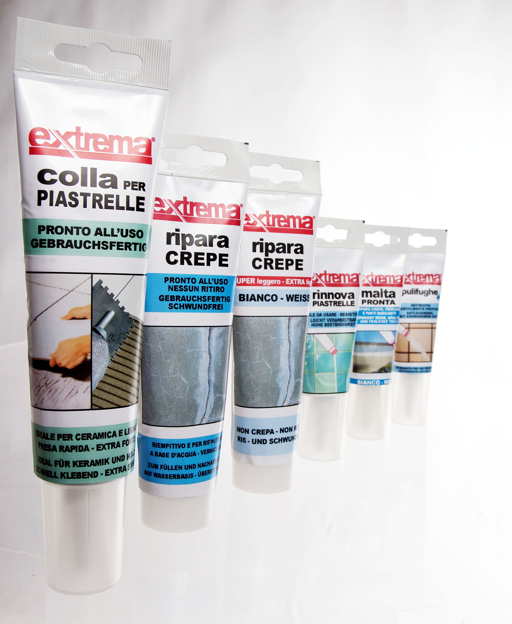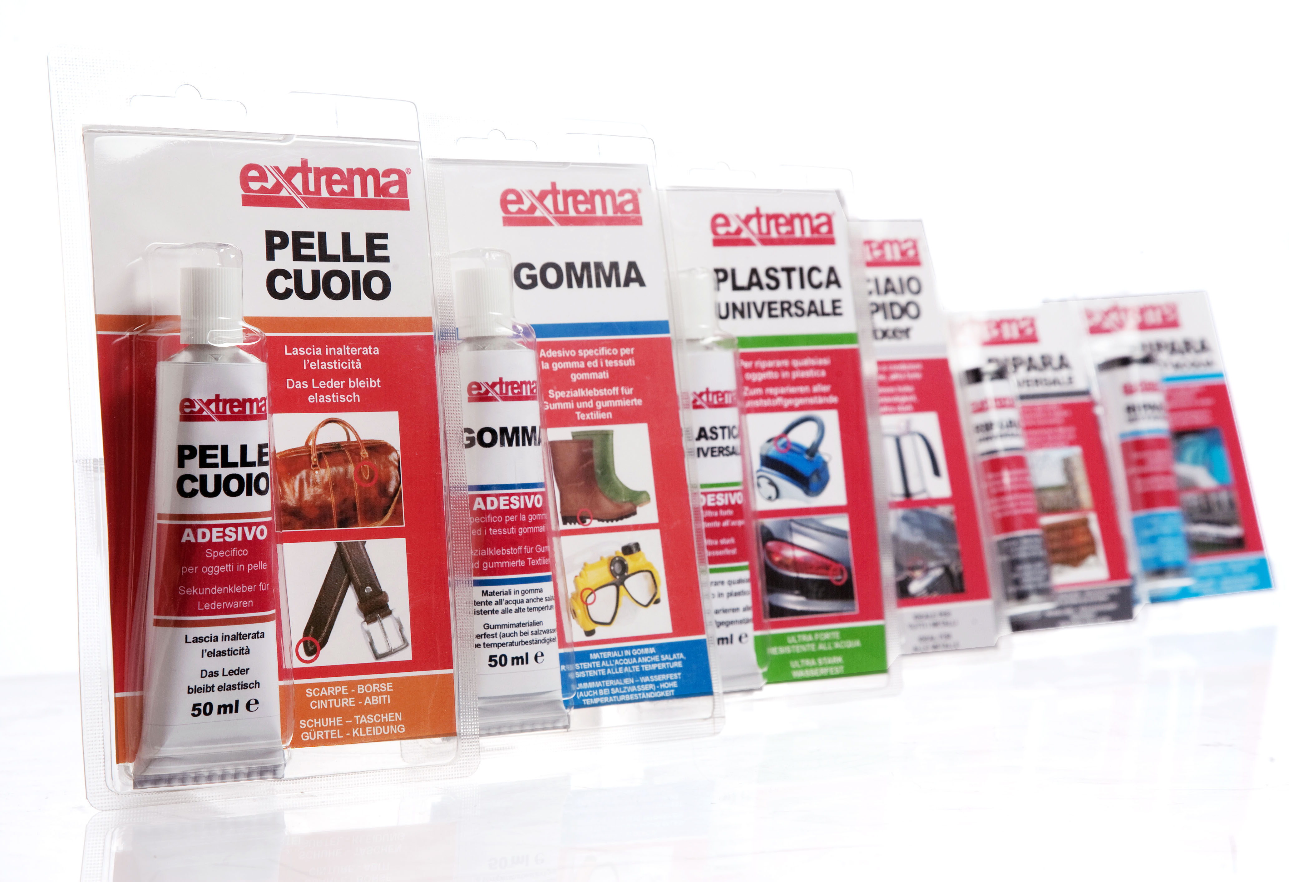 Mario Calasso: La gamma Extrema raggruppa le seguenti famiglie: adesivi, colle, siliconi e sigillanti, prodotti di servizio legati al fai da te. Ma Extrema non è solo prodotto: è anche packaging, merchandising, personalizzazione e post-vendita. La nostra linea, ad esempio, viene esposta anche in display e palbox a seconda delle esigenze, per promuovere l’applicazione specifica di ogni prodotto e per rendere maggiormente comprensibile l’utilizzo anche dei prodotti che possono sembrare più sofisticati. Il post–vendita attualmente viene fatto su richiesta e personalizzato di volta in volta. Siamo consapevoli che sviluppare prodotti nuovi in un settore dove non manca più nulla non ha molto senso. Per questo abbiamo pensato di realizzare un packaging innovativo per un settore come il nostro, che ha riscontrato e sta riscontrando ampio successo: il tubetto in laminato. Interamente formato in casa lo consideriamo la nuova generazione di packaging, perchè la sua struttura multistrato lo rende adatto al confezionamento di molteplici prodotti.