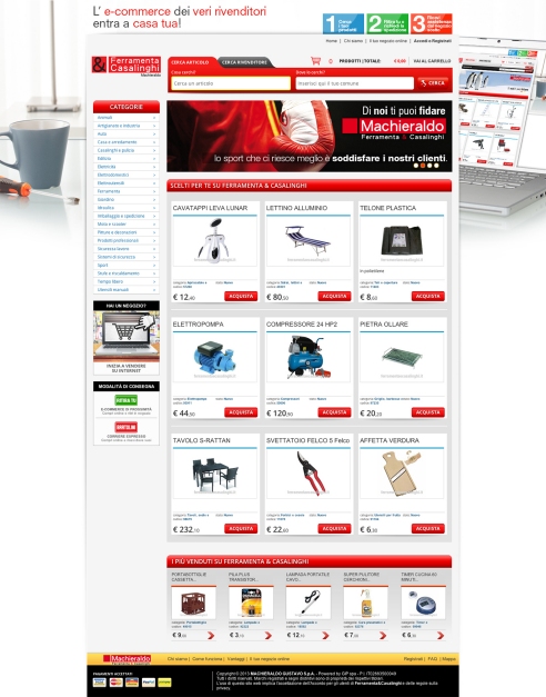 GIP: Ferramenta&Casalinghi è un portale internet che nasce dalla consolidata partnership tra Machieraldo e GIP con lo scopo sociale di far avvicinare i rivenditori tradizionali al mondo delle vendite su internet ed aiutarli a crescere in questo nuovo mercato. Un mondo al quale ormai non ci si può sottrarre e che in un momento difficile come questo è in controtendenza rispetto al generale appiattimento dei consumi, segnando un +22% di fatturato nel 2012. In quest’ottica nasce Ferramenta&Casalinghi che “vede la luce” sul web nell’ottobre del 2012.