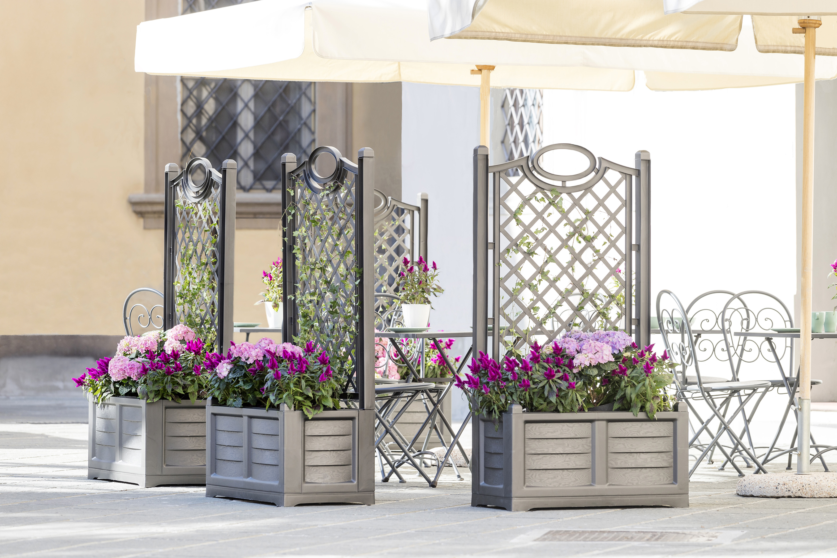 Rossella Baiocchi: Ti faccio una premessa: trovo che l’espressione distanziamento sociale sia veramente brutta, fredda e impersonale: questi mesi sono stati molto difficili per tutti, ma adesso che possiamo ricominciare a uscire, perché non scegliere di vivere questa nuova normalità nel rispetto della distanza con divisori al profumo di gelsomino o di rosa rampicante? La nostra idea è questa, creare divisori green con piante rampicanti usando le nostre fioriere Separè dall’elegante decoro simil legno: in questo modo ci sembrerà di pranzare in un magnifico giardino fiorito.