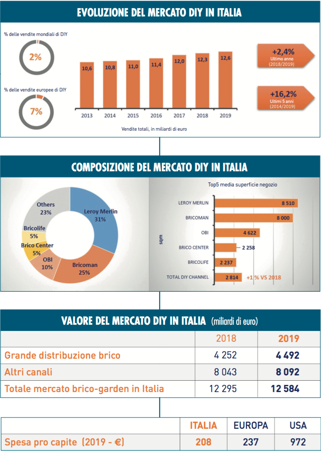 Michele Zucca: Il report è uno strumento molto valido e indispensabile per chi si affaccia per la prima volta nel canale DIY italiano o in quelli esteri. Per quanto riguarda il nostro Paese, posso anticiparti che nel 2019 il mercato DIY ha realizzato un fatturato totale di 12,5 miliardi, con una crescita del 2,5% sul 2018 e del 16% nell’ultimo quinquennio (4,5 miliardi se si considera il canale specifico DIY e 8 miliardi gli altri canali). In Italia si registra inoltre una spesa pro capite di poco più di 200 euro, ancora bassa se si considera la media europea di 237 euro e addirittura quella statunitense di 972 euro.