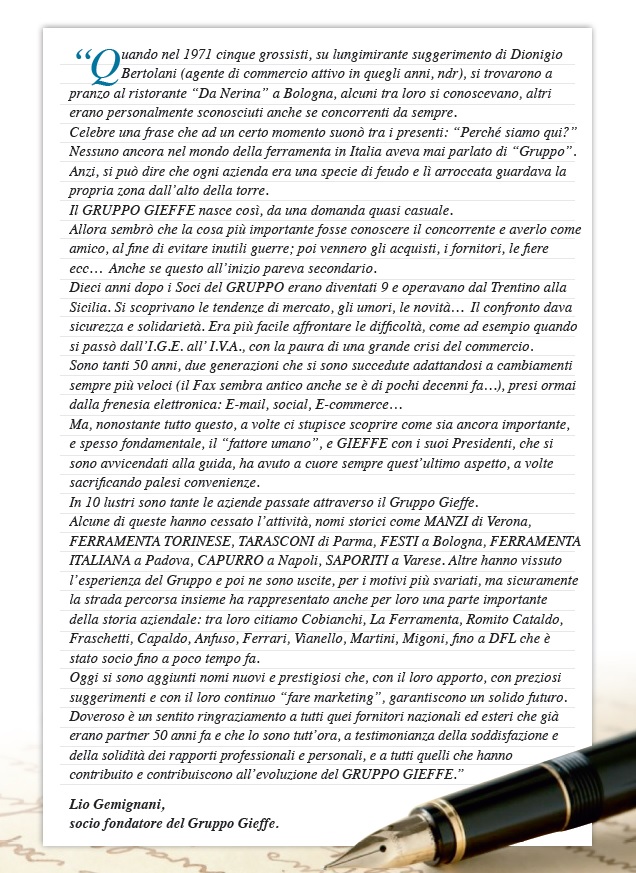 E proprio da uno dei soci fondatori, Lio Gemignani, titolare del grossista veneto Fabrizio Ovidio, riceviamo e pubblichiamo con estremo piacere un testo in cui si racconta, con dovizia di particolari e di aneddoti, la storia della nascita del gruppo Gieffe e la sua evoluzione fino a oggi.