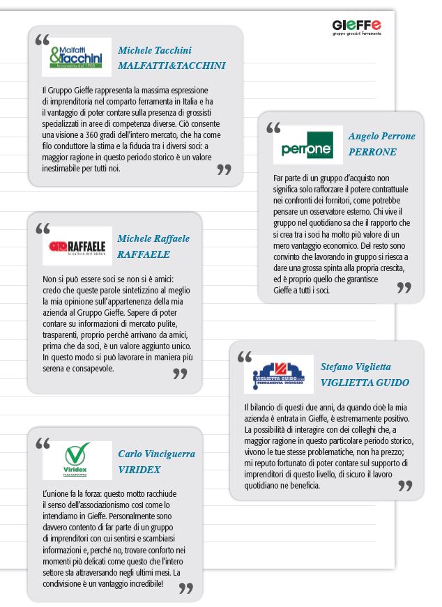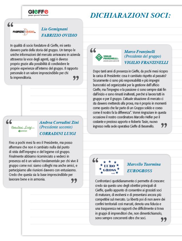 Di quei cinque pionieri, due sono ancora in Gieffe: si tratta di Corradini e di Fabrizio Ovidio che, oggi, insieme a Franzinelli, Eurogross, Malfatti&Tacchini, Perrone, Raffaele, Viridex e Viglietta Guido fanno parte della squadra del più storico tra i gruppi di grossisti di ferramenta d’Italia.