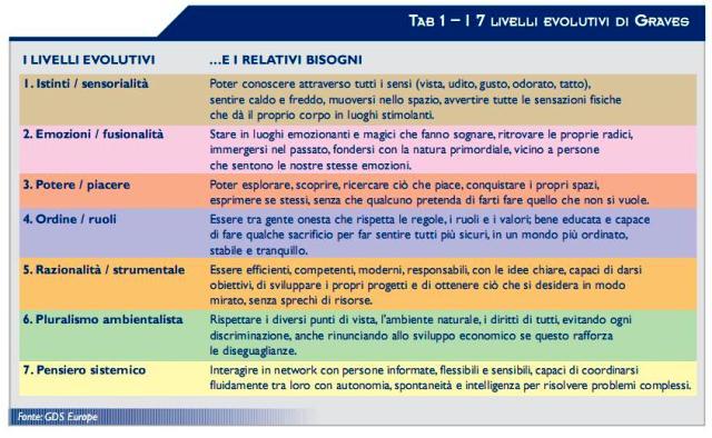 Nella tabella 1 sono illustrati i 7 livelli evolutivi di Graves, presenti in ognuno di noi con gradi di importanza e profondità diversi.