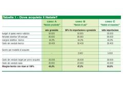 Proviamo a fare questo gioco e vediamo che cosa accade. La situazione prevede tre punti vendita che debbono approvvigionarsi di prodotti natalizi. Il negozio A, “Natale prudente” decide di trovare dei grossisti e/o degli importatori da cui acquistare la totalità della merce. Nel caso di B, “Natale di più” si decide di osare un poco e di importare direttamente il 50% del fabbisogno. Mentre C, “Natale al massimo”, importa tutto. Ovviamente è noto che chi importa paga prima e ha dei costi di logistica, stoccaggio e magazzino che non ha chi acquista man mano, ma è altrettanto vero che paga meno la merce. Quindi diamo un bonus del 10% sul costo dell’importazione.