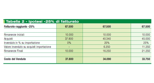 Poiché lo scenario indica un possibile calo del 25% delle vendite significa che l’invenduto sarà pari al 25% sull’importato. Iniziamo a commentare la situazione man mano che procediamo nello sviluppo dei dati (vedere tabella 1).