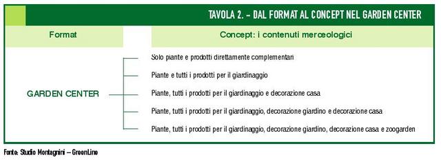 La tavola 1 evidenzia uno schema che offre una visione del processo evolutivo. L’estrazione del garden può partire dalla floricoltura, dal vivaismo o da un negozio dedicato all’agricoltura, la classica agraria. Ricombinando gli indicatori di struttura, prende origine il formato di base che è l’elemento di partenza su cui lavorare per creare ulteriori passaggi evolutivi.