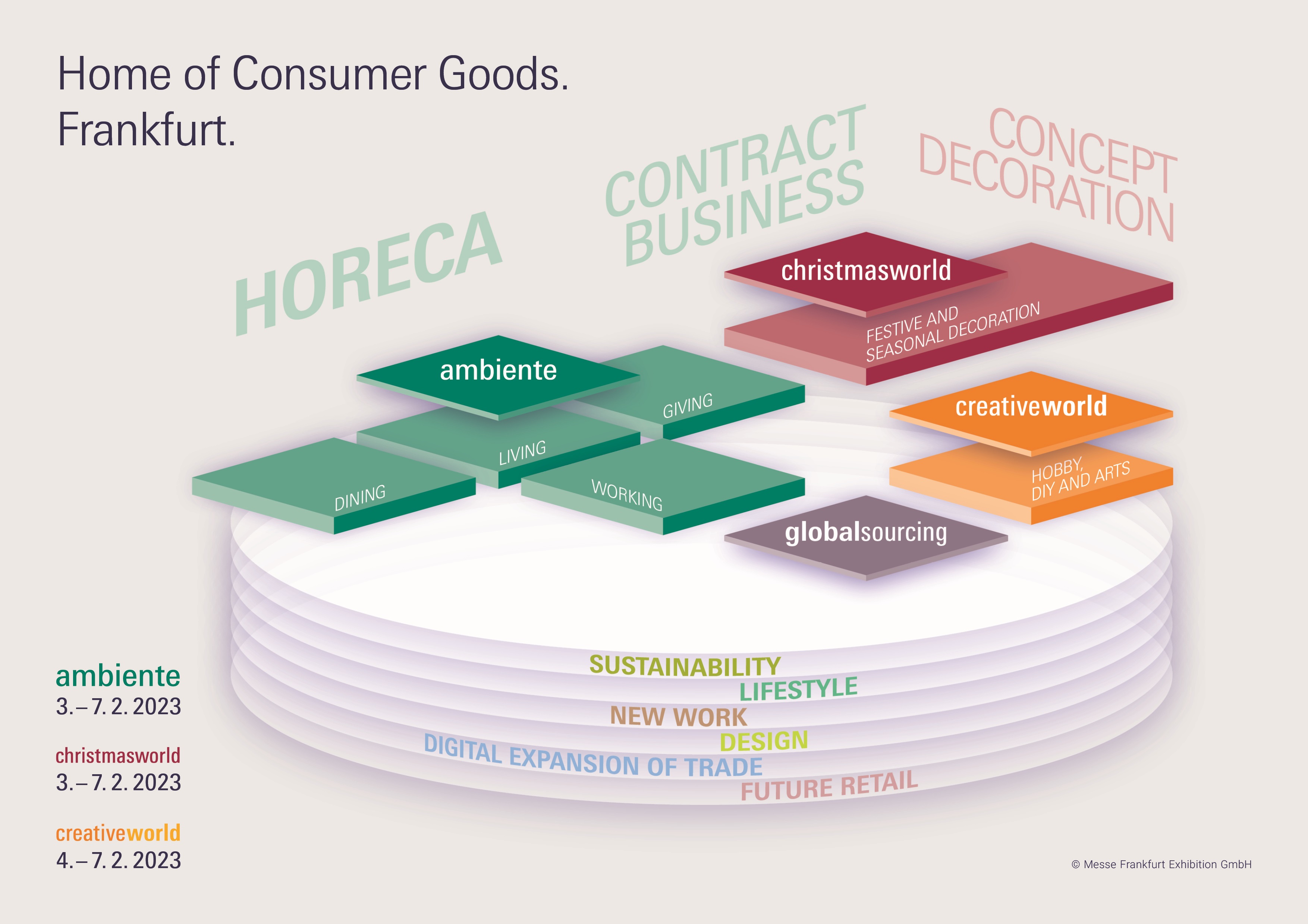 Manca poco più di due mesi dall'inizio di Home of Consumer Goods, il nuovo concept che riunisce Ambiente, Christmasworld e Creativeworld, che avranno luogo a Francoforte dal 3 al 7 febbraio 2023 (Ambiente e Christmasworld) e dal 4 al 7 febbraio (Creativeworld).