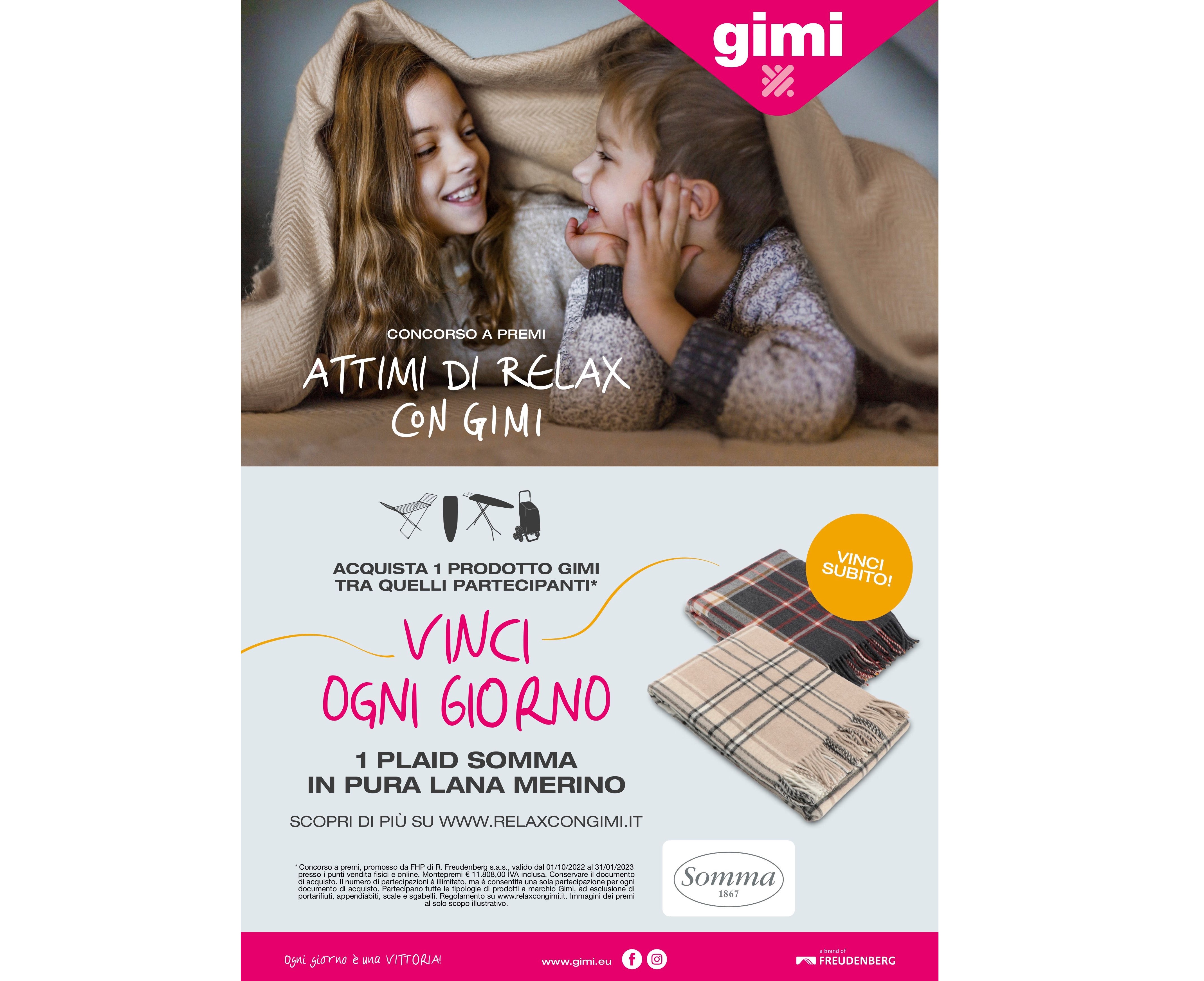 Fino a l 31 gennaio, i consumatori che acquisteranno – presso i punti vendita fisici e online che aderiscono alla promozione – un prodotto Gimi tra quelli coinvolti nell’iniziativa, avranno la possibilità di partecipare all’Instant Win e scoprire subito se hanno vinto un plaid Somma in pura lana merino, in palio ogni giorno.