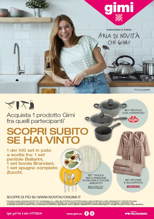 Fino al 31 luglio, i consumatori che acquisteranno – presso i punti vendita fisici e online che aderiscono alla promozione – un prodotto Gimi tra quelli coinvolti nell’iniziativa, avranno la possibilità di partecipare all’Instant Win e scoprire subito se hanno vinto uno dei 100 set in palio, a scelta tra: un set di pentole con coperchio Ballarini, un set tavola Brandani per 6 persone in decori e colori assortiti e un set spugne completo Zucchi.