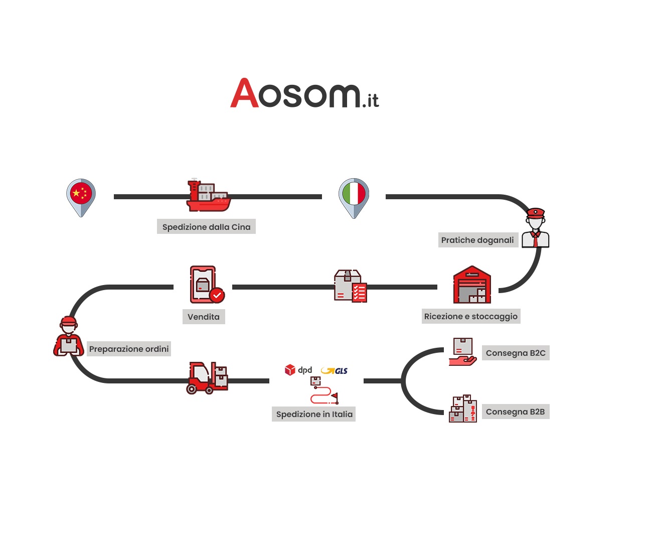 Aosom, presente in 12 Paesi con 7 filiali e 20 magazzini proprietari, di cui due in Italia e un terzo in arrivo, valorizza la propria esperienza nella gestione e nella distribuzione dei prodotti dedicati all’e-commerce e la propria conoscenza delle dinamiche del commercio orientale per fornire, attraverso Aosom Logistics, un servizio di logistica focalizzato sulle spedizioni voluminose, elemento distintivo fra le sue competenze.