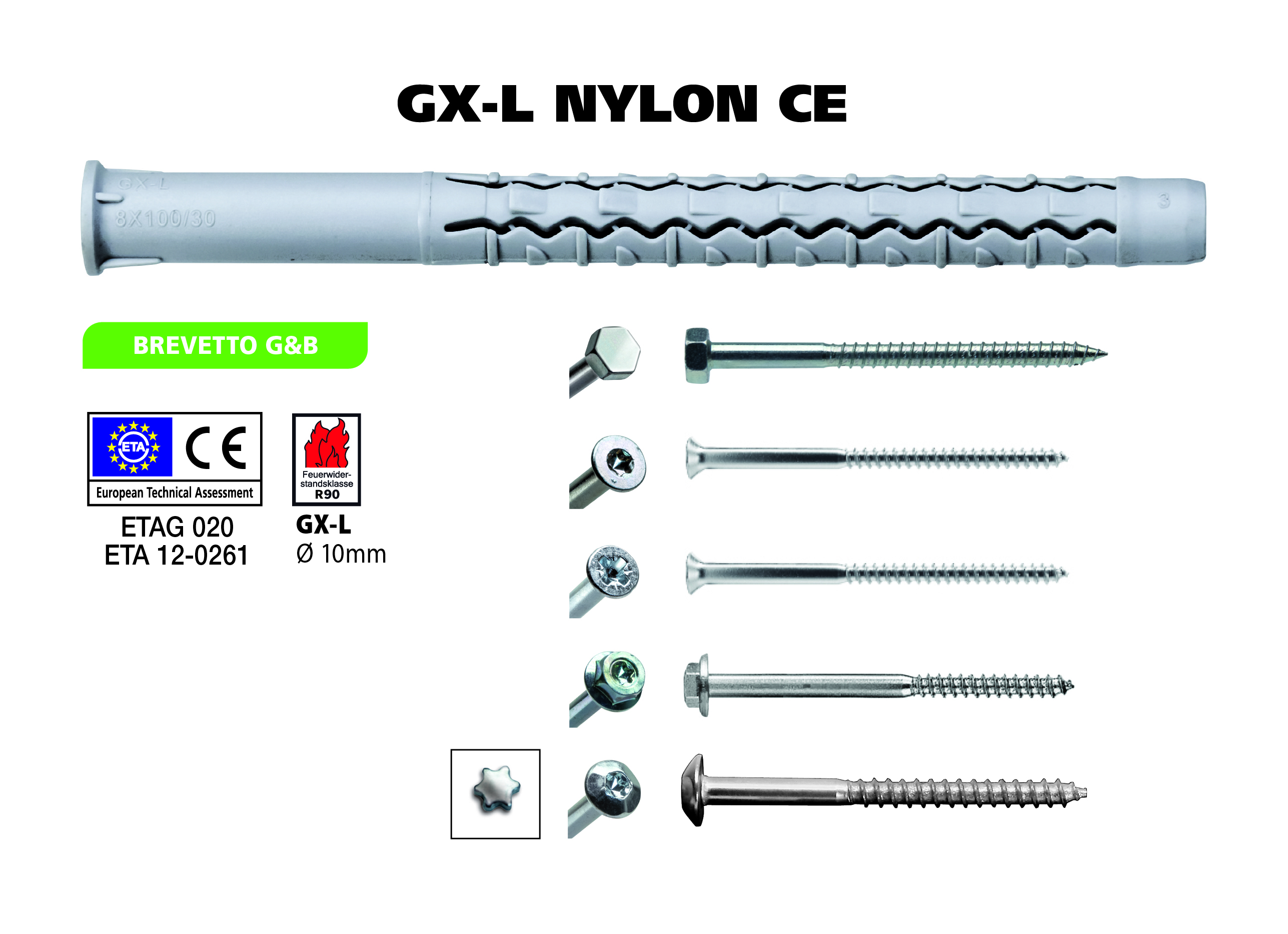 • L’ancorante GX-L Nylon brevetto G&B FISSAGGI, campione di vendite, Certificato CE per applicazioni su calcestruzzo, muratura piena e forata.Si tratta di un ancorante per fissaggi prolungati con un corpo espandente a 4 settori utile ad aumentare la capacità di tenuta su tutti i materiali edili.