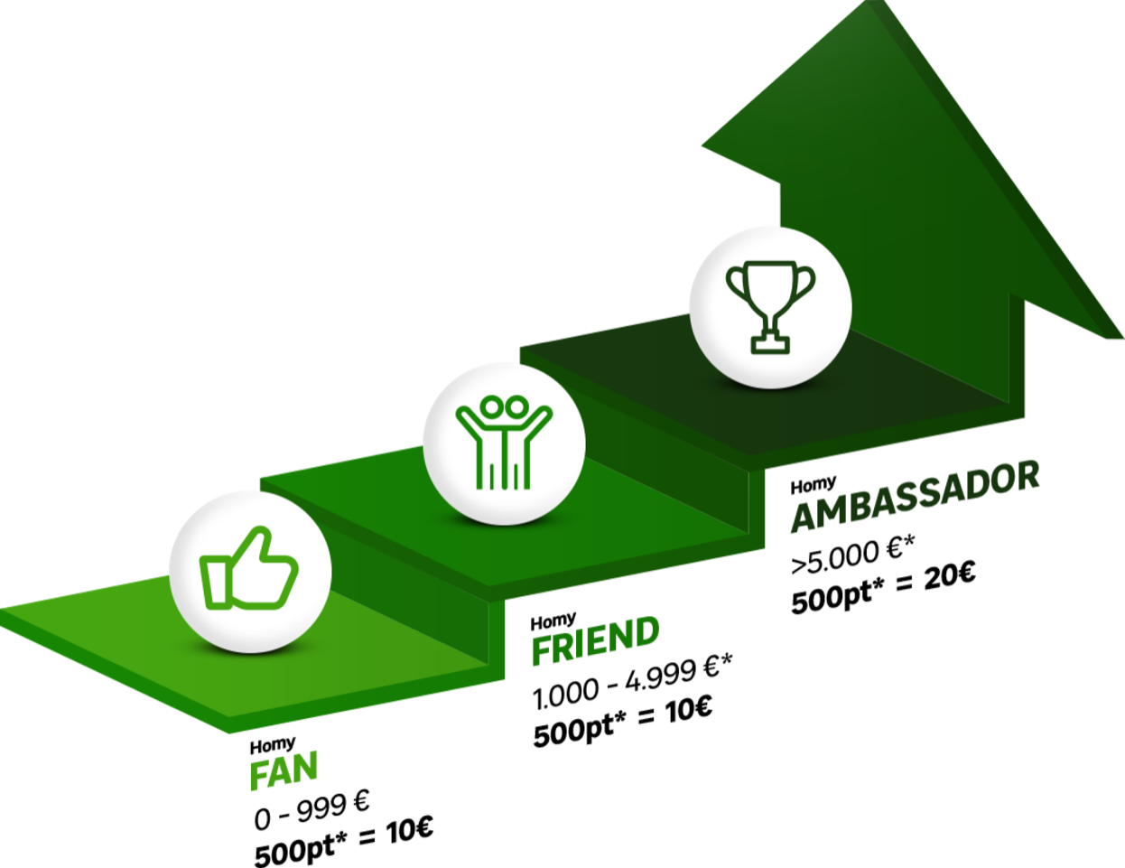 Il nuovo programma è ricco di novità. Prevede tre profili di membership, suddivisi per fasce di spesa: Homy Fan, fino a 999€; Homy Friend, da 1.000€ a 4.999€ e Homy Ambassador, con una spesa sopra i 5.000€.