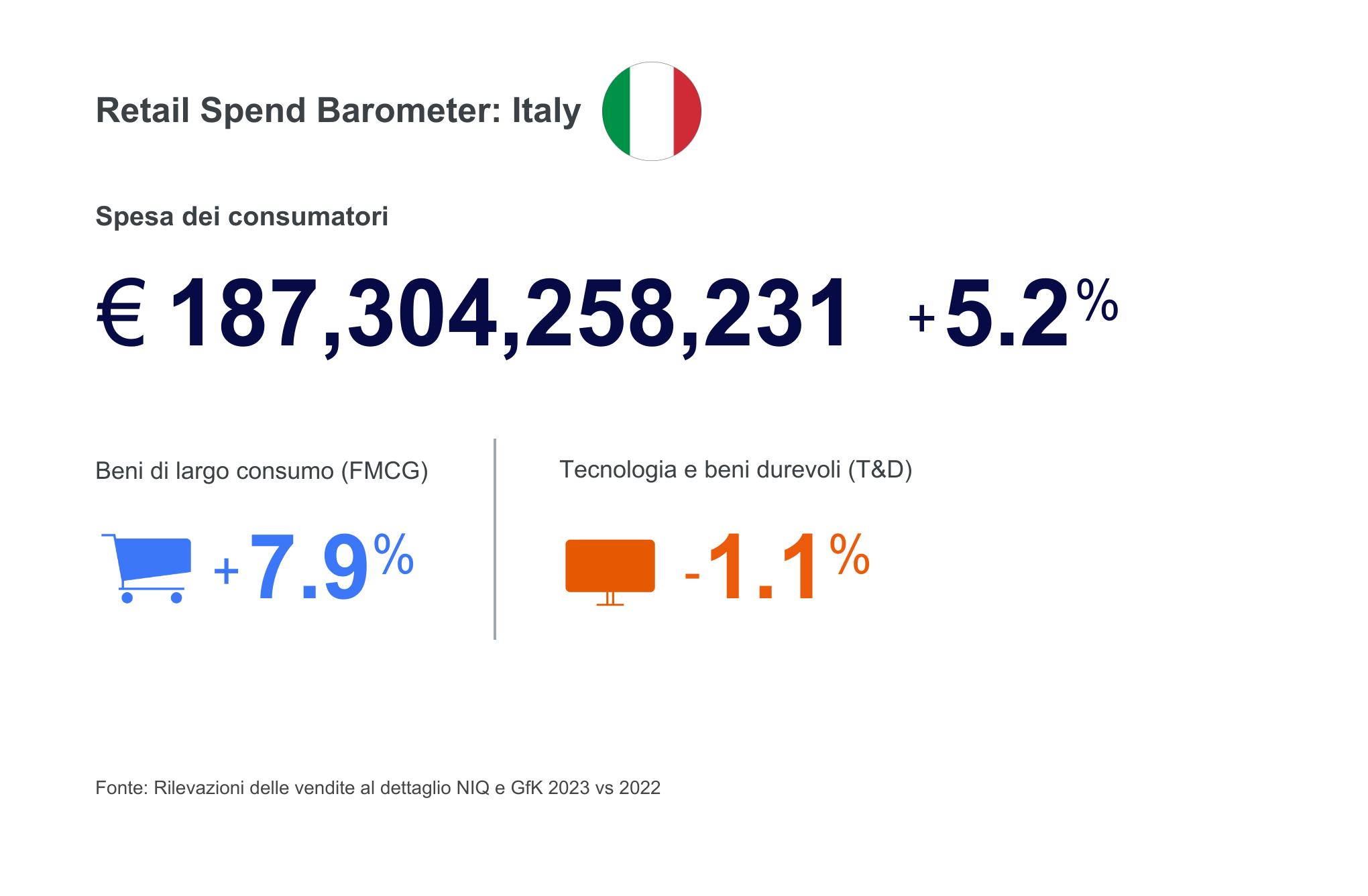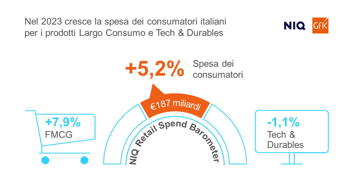 In Italia, la spesa dei consumatori per i beni di largo consumo (FMCG) e per i beni tecnologici e durevoli (T&D) è aumentata del 5,2% rispetto al 2022, registrando un fatturato complessivo di 187 miliardi di euro. L'aumento è stato determinato in particolare dalla crescita del prezzo dei prodotti alimentari e per la cura della persona, mentre gli italiani sono rimasti più cauti nelle spese di alcuni prodotti T&D. Il nuovo Barometro dei Consumi di NIQ - The NIQ Retail Spend Barometer - combina i dati di NIQ e GfK per misurare il giro d’affari dei prodotti del largo consumo, dei beni tecnologici e durevoli acquistati negli store in Italia.
