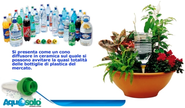 Aquasolo è un sistema che consente di irrigare le piante di casa in casa di assenza prolungata. Si tratta di un cono diffusore in ceramica (l’unico del suo genere in ceramica) sul quale (grazie a tre possibilità di avvitamento) si possono fissare la quasi totalità delle bottiglie di plastica presenti sul mercato. Quindi è sufficiente riempire la bottiglia, avvitare Aquasolo e piantare il cono nella terra della pianta da irrigare.