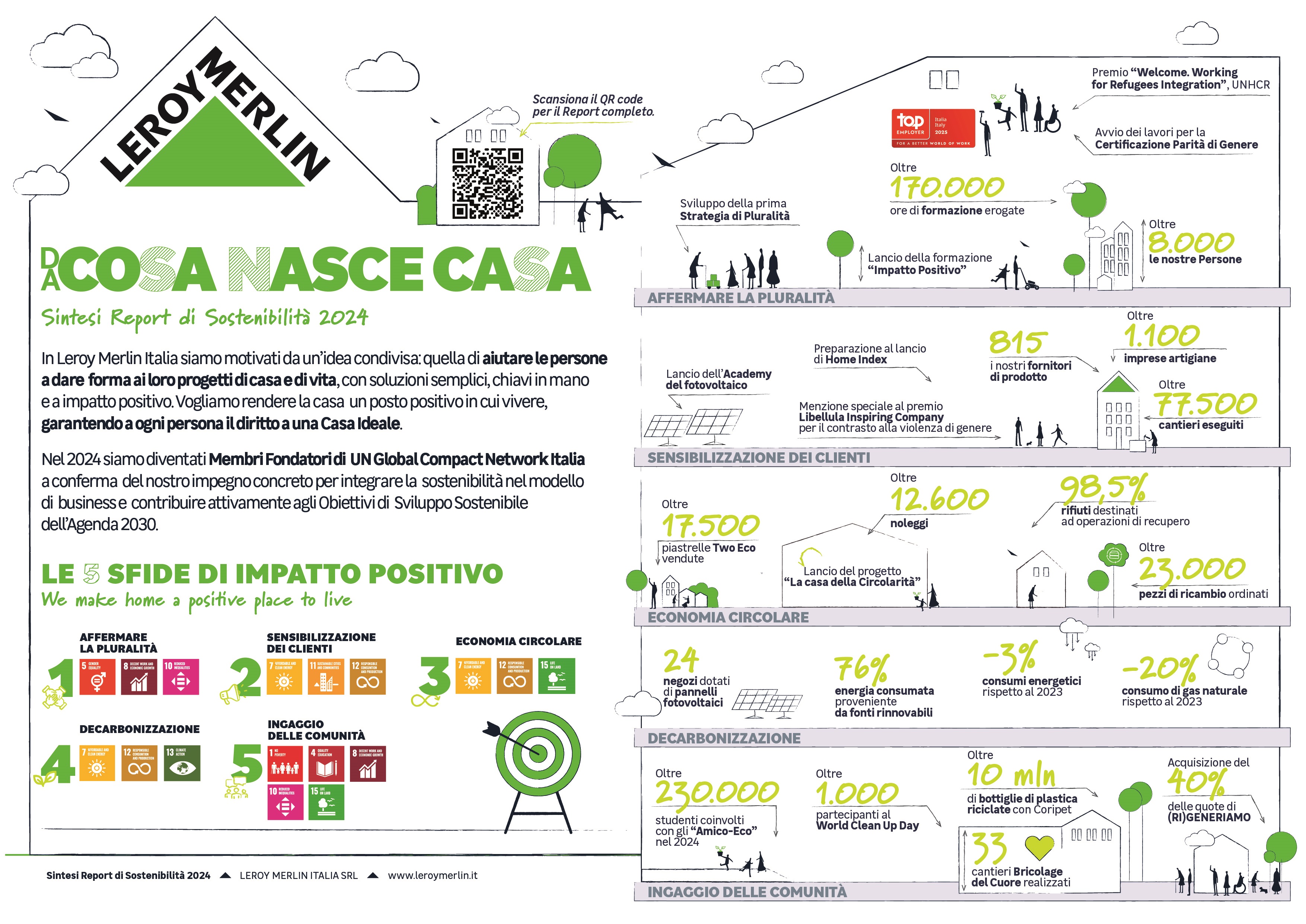 “Il cambiamento a cui ambiamo parte da dentro Casa nostra; attraverso la nostra strategia di Impatto Positivo, fondata su cinque sfide chiave - Affermare la Pluralità, Sensibilizzazione dei Clienti, Decarbonizzazione, Economia Circolare e Ingaggio delle Comunità - stiamo costruendo, mattone dopo mattone, un modello di impresa capace di generare valore condiviso.” ha commentato Barbara Casartelli, Leader Impatto Positivo di Leroy Merlin Italia. “Crediamo profondamente che ogni azione, anche la più semplice, possa contribuire a costruire non solo case più sostenibili e accoglienti, ma anche a custodire e rispettare la casa più grande che tutti abitiamo: il nostro pianeta. È proprio questa la convinzione che ci ha guidato nell'intitolare il nostro Report di Sostenibilità 2024 Da Cosa nasce Casa.”