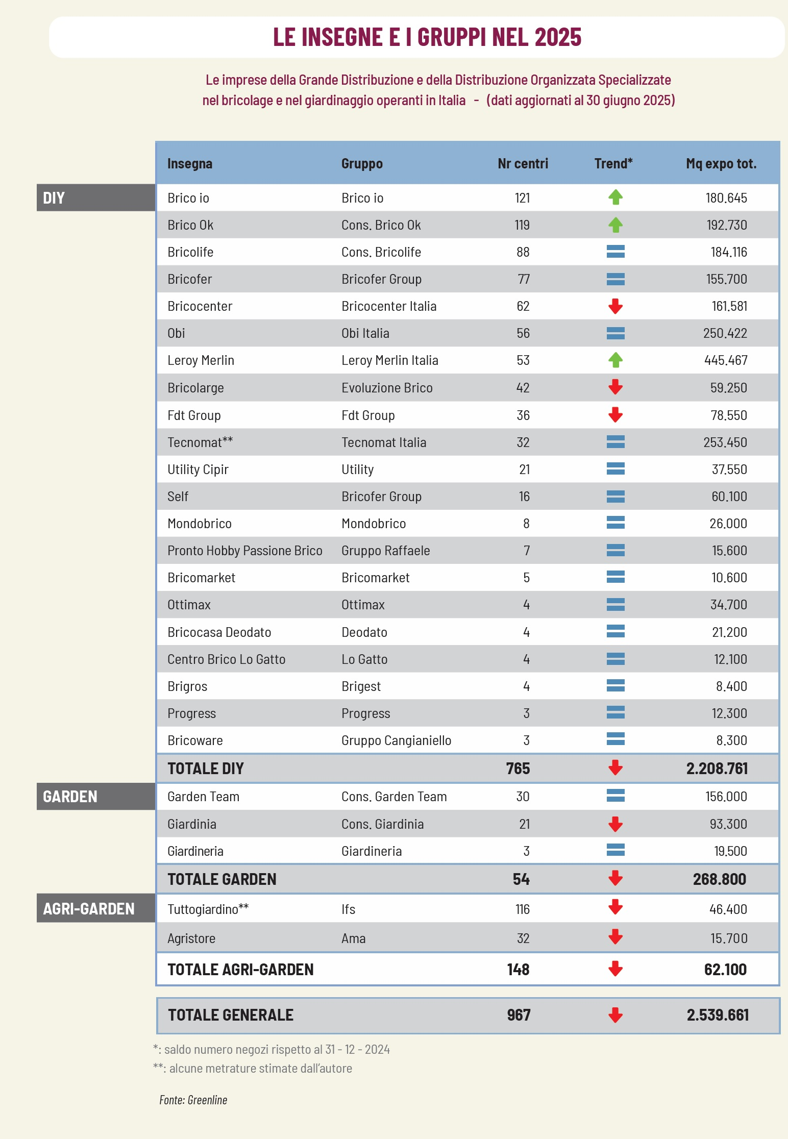 La diminuzione riguarda tutti i tre comparti analizzati: i centri bricolage sono 765 (contro i 768 di fine 2024), i garden center 54 (erano 56) e gli agri-garden 148 (154).