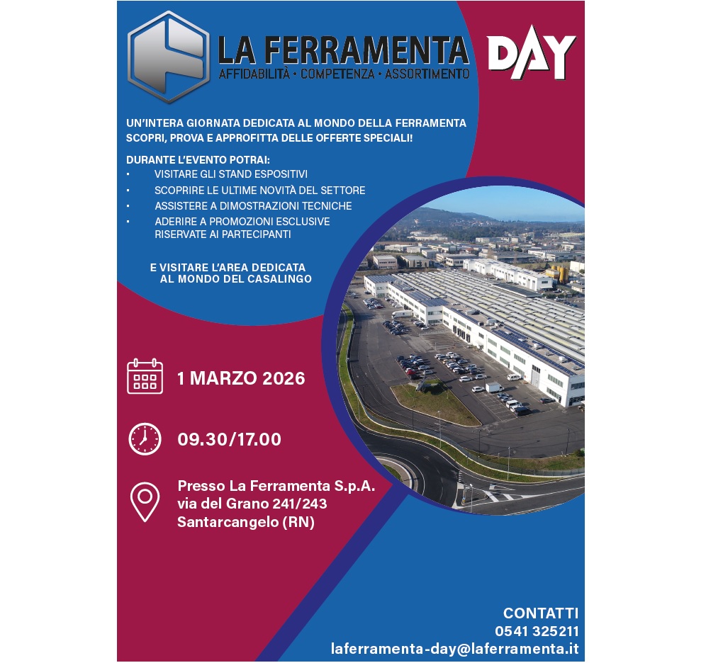 Circa 50 fornitori presenti, dimostrazioni tecniche, promozioni esclusive, aree dedicate al mondo Casalingo, Garden e ai marchi Labor e Tavola&Co.: sono queste le principali novità attese de “La Ferramenta Day”, l’evento organizzato dall’omonimo grossista del Gruppo Bonori che si svolgerà presso la sede di Santarcangelo di Romagna (RN) il prossimo 1° marzo.