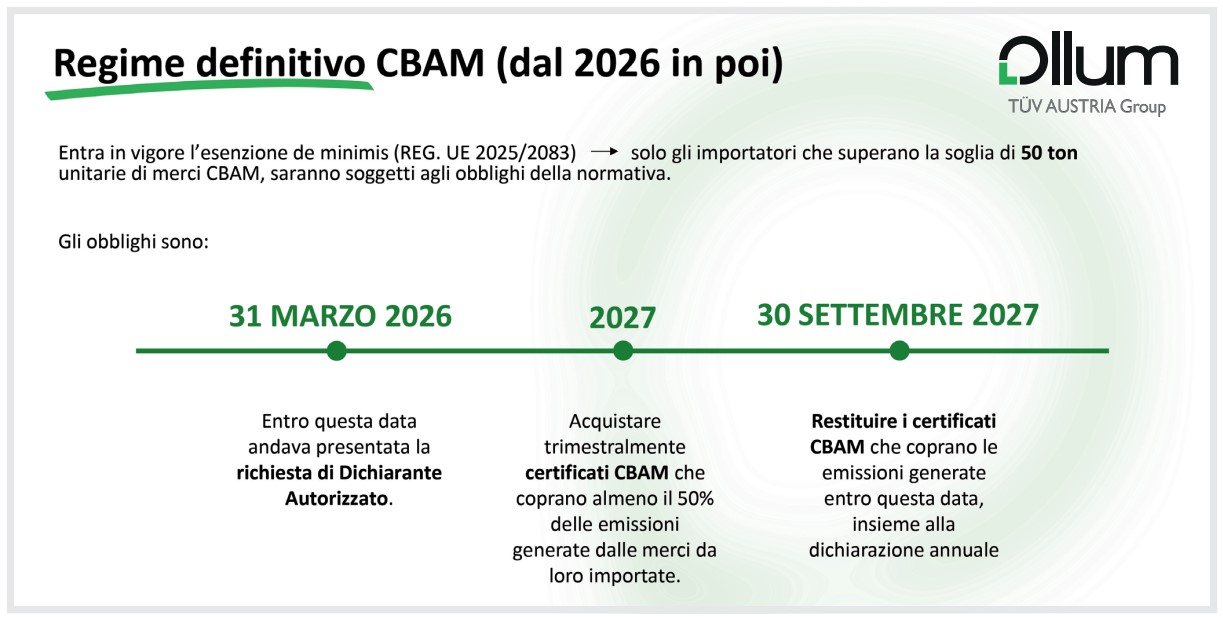 • Nel corso del 2026 e 2027: scatterà l’obbligo di acquistare trimestralmente i certificati CBAM. Questi titoli serviranno a coprire le emissioni generate per produrre gli articoli importati.
