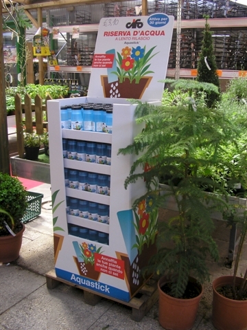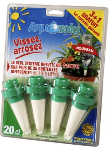 Aquasolo, distribuito da Guaber, è un cono diffusore in ceramica sul quale si possono avvitare la quasi totalità delle bottiglie di plastica presenti sul mercato, grazie a tre possibilità di avvitamento. Si riempie la bottiglia, si avvita Aquasolo, si pianta il cono nel terreno e il gioco è fatto!