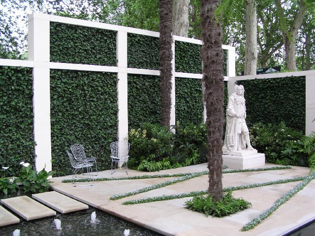 Le pareti verticali sono utili per coprire superfici brutte da vedere e per isolare giardini dal rumore urbano. Elevate pareti verticali sono state create in A Cadogan Garden usando hedera helix Woerner piantata su una rete metallica.