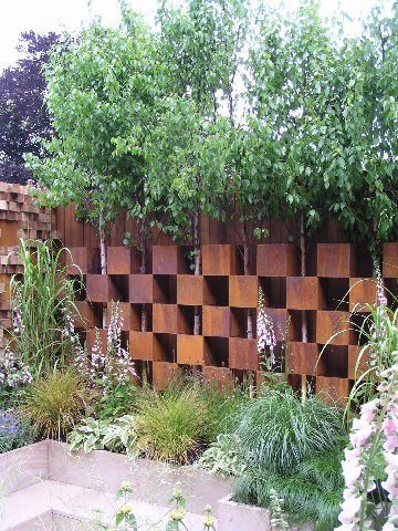 Nel Pemberton Greenish Recess Garden, un piccolo giardino urbano, due pareti verticali sono state piantate con un misto di fogliame e fiori di erbacee perenni. In un’altra parete, tronchi di betulla albosinensis Fascination sono stati intrecciati in scatole metalliche in un disegno a scacchi.