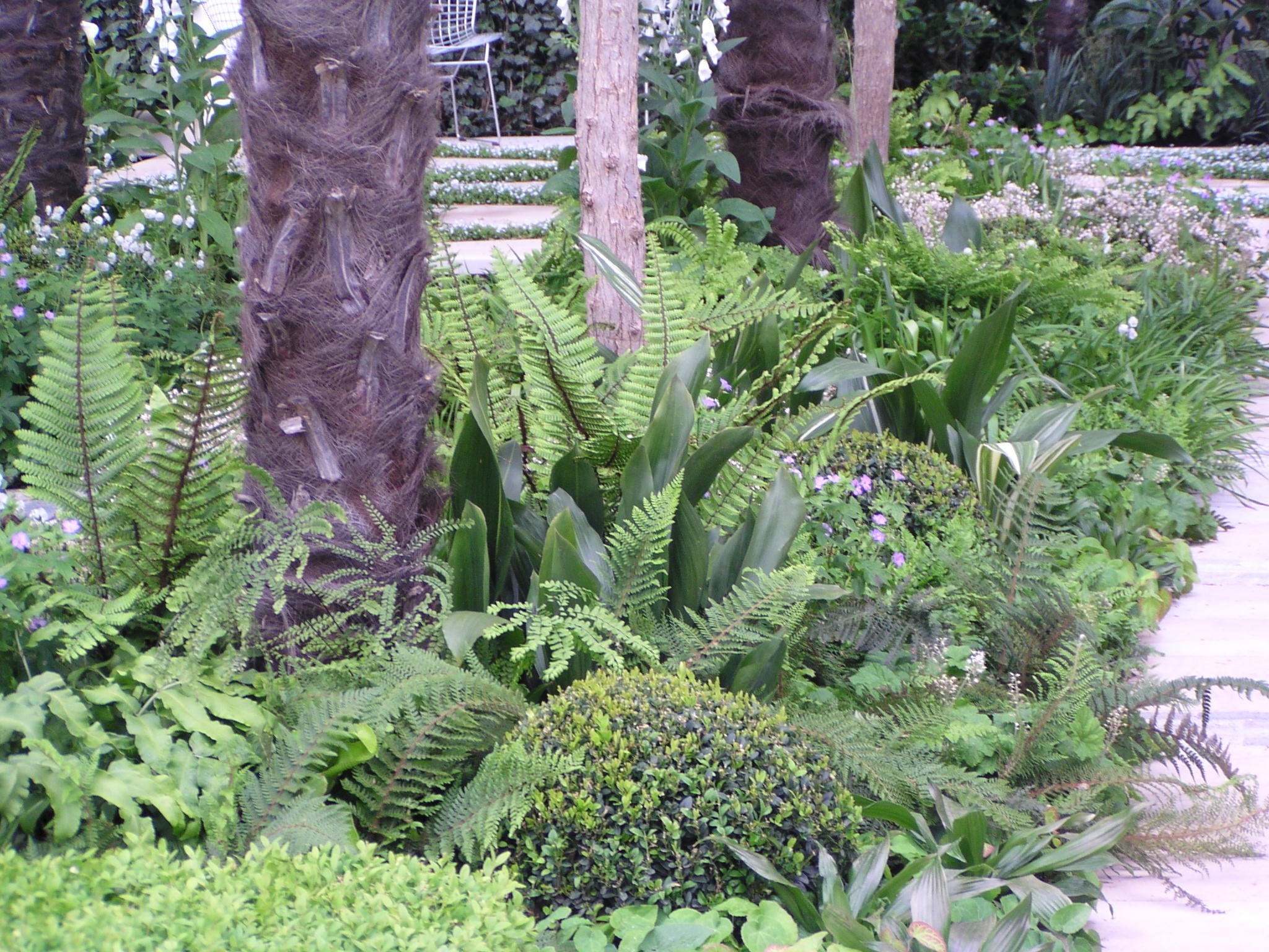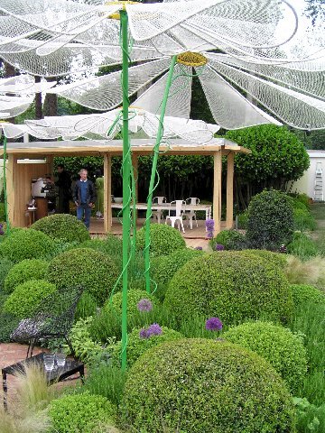 Il verde nelle sue svariate nuance ha dominato la maggioranza dei giardini dimostrativi quest’anno. Non solo come colore rilassante, ma anche come naturale sottofondo per fiori, foglie, altre parti di piante e oggetti da giardino. Un ottimo esempio è offerto da Laurent Perrier Garden, che ha proposto un miscuglio di foglie verdi, fiori bianchi, innaffiatoi in zinco blu-grigio e sentieri di piastrelle fiamminghe.